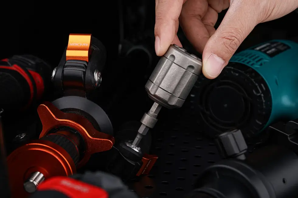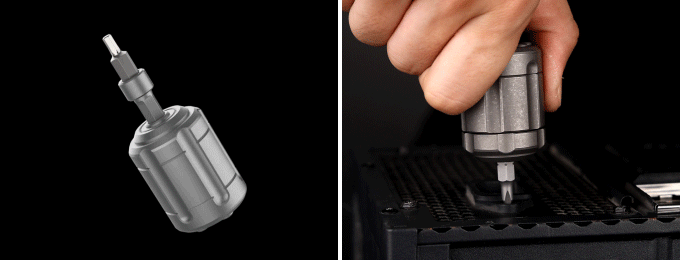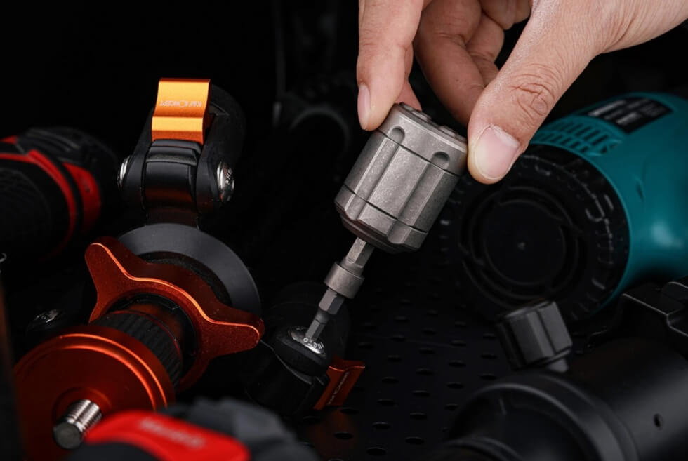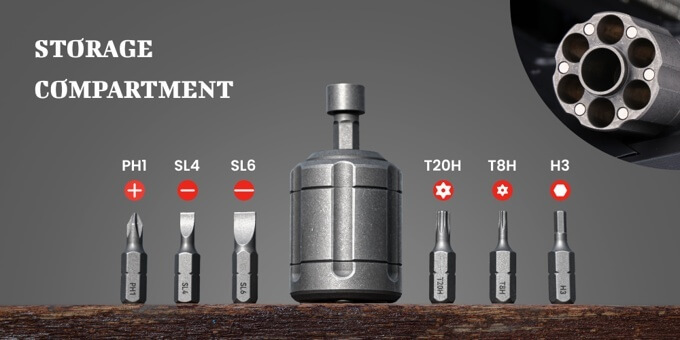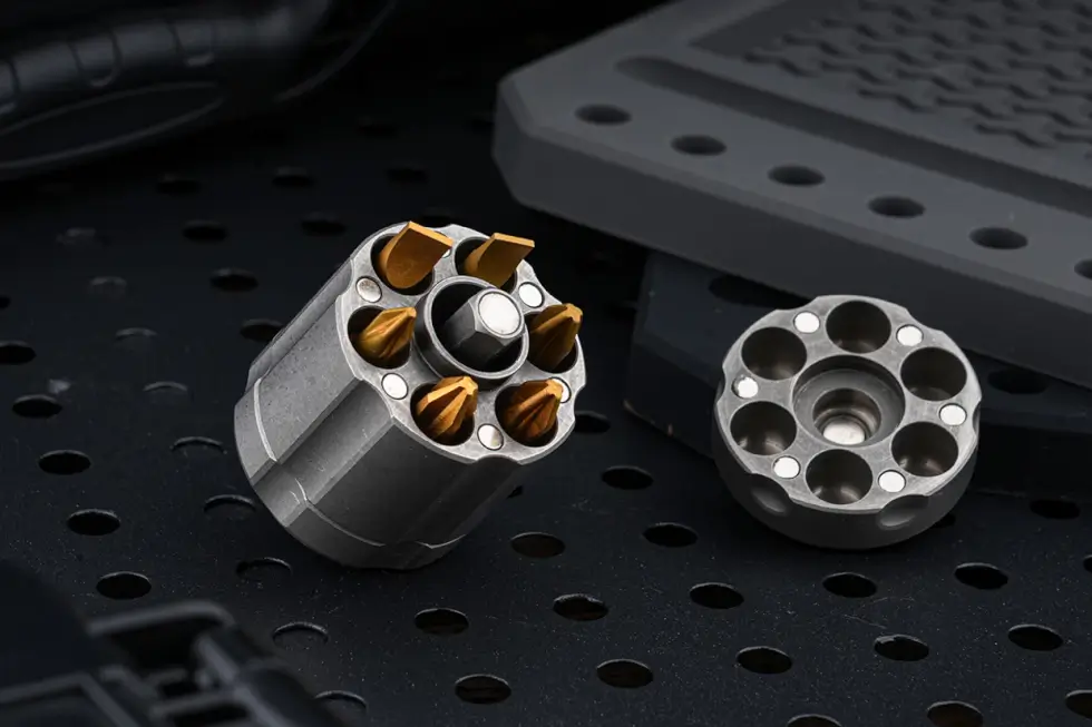 The IdeaSpark Revolver S is roughly the size of a C battery, measuring 1.69″ long (43 mm) and 1.22″ in diameter (31 mm). The barrel serves as a secure magnetic bit storage for six standard 1/4″ bits.