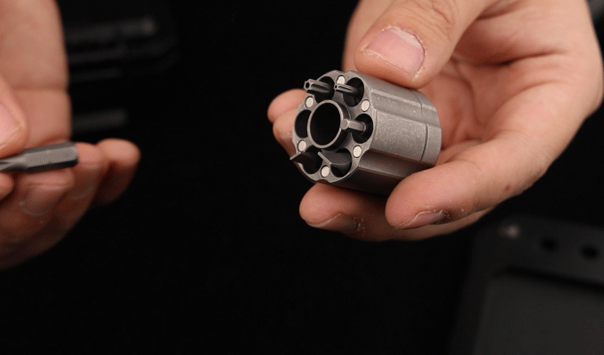 This utility tool features a ratcheting system for convenient and easy indoor and outdoor fixes. It’s a pocketable and keychain-sized tool shaped like the chamber or cylinder of a revolver, hence its name.