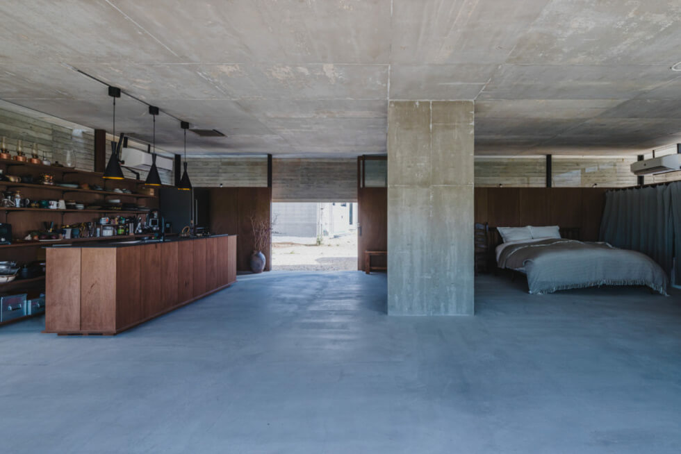 The solid concrete structure then looks like it’s floating and this is by design. The client wanted a home with a flexible interior and a clear view of the ocean and “wind flowing through all day long.” To achieve this, wood-framed, sliding glass doors then envelope the home which when fully opened, allow the ocean breeze to flow through the interiors.