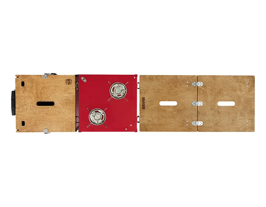 It’s an all-in-one kitchen system in a self-contained box, making it ideal for outdoor adventures. It comes built with a cooking setup and doubles as a dining and food prep table too. This camp kitchen has a two-burner stove system engineered by camping brand Kovea. Each burner delivers 7500BTU of power and has adapters compatible with butane and propane.