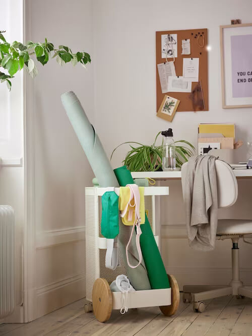 Take the sturdy and versatile DAJLIEN exercise bench with storage, which is inspired by old-school gym equipment. It is the collection’s focal point of multi-functional design. It comes with a non-slip mat and when not in use for exercise, it offers practical storage solution for your gear. It also makes a sturdy coffee table around the home.