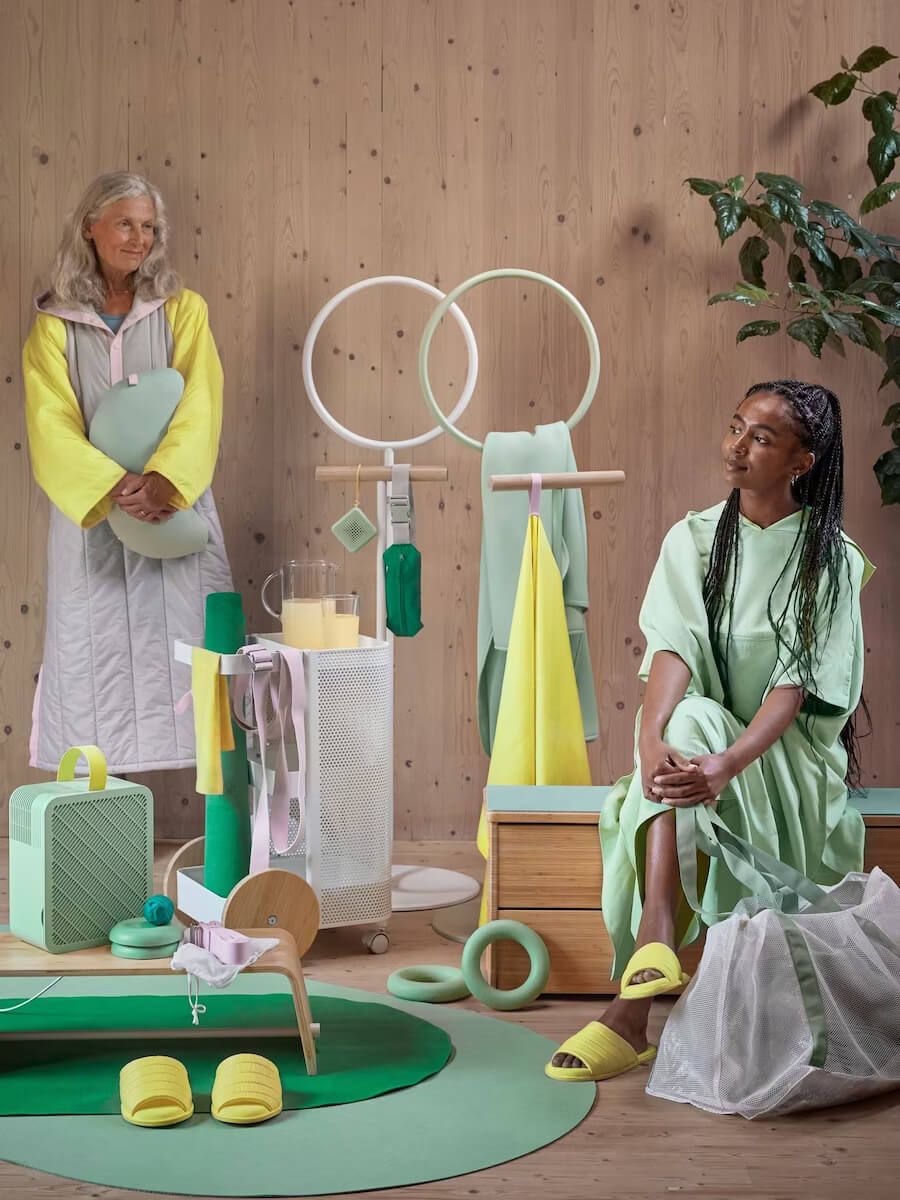 IKEA also turned a workout bench into a trolley to store other exercise equipment, bottles, towels, mats, and more. Then there’s a step-up board and a set of ring-shaped dumbbells that make stylish bookends. The DAJLIEN collection extends beyond fitness gear to incorporate recovery and stress relief products. These include an air purifier, yoga straps, kneepads, a massage ball, and a portable Bluetooth speaker. It also has several wearable pieces like slippers and ponchos for post-workout relaxation and wellness.