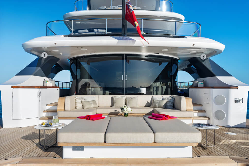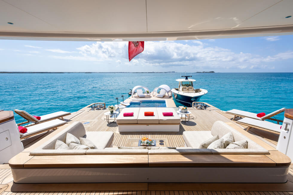 Likewise, the outdoor options can be found on the sun deck, foredeck, and aft deck. The latter features a beach club replete with sunpads, sun loungers, a dip pool, and a lounge area. Head up to access the jacuzzi and another lounge with modular furniture. A Scout 425 LXF tender also accompanies the CONTIGO.