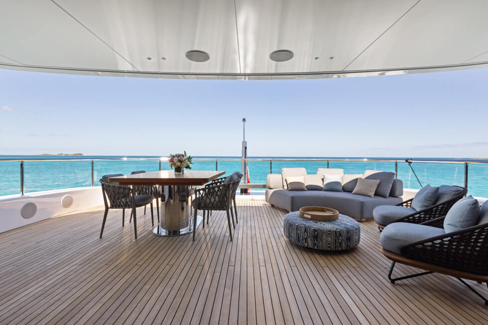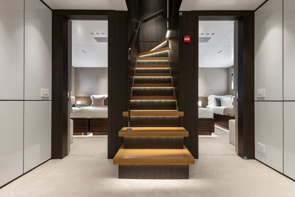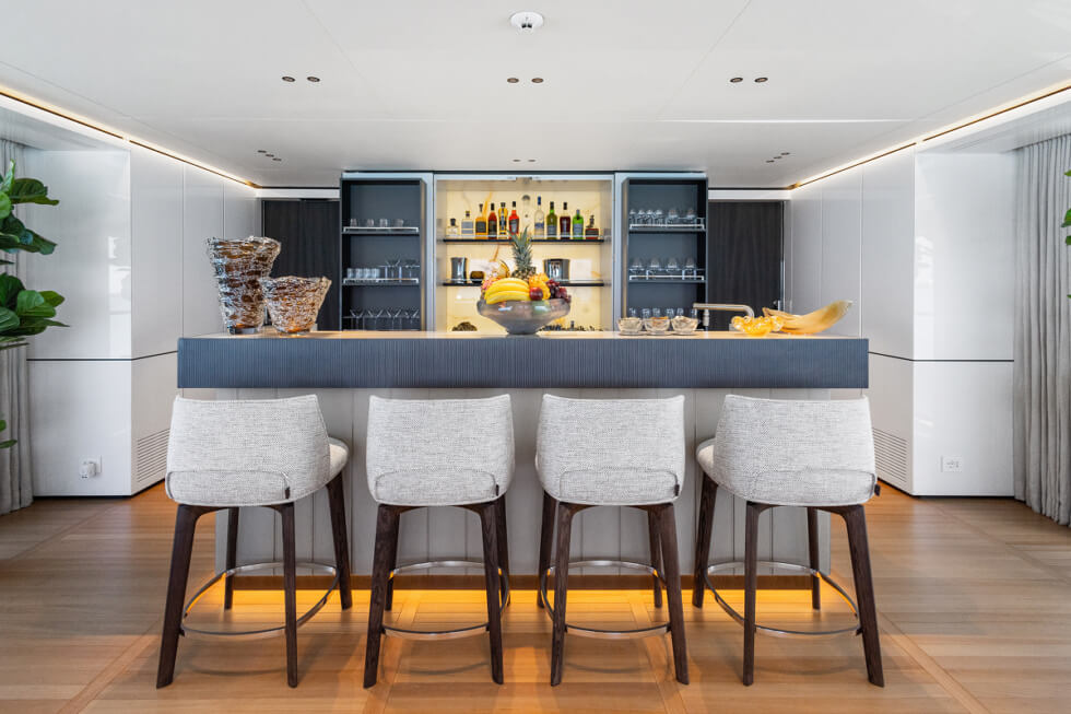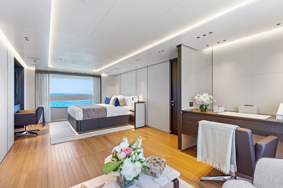 As one can expect from a superyacht of its caliber, high-class amenities abound! There is a full-beam owner’s suite that comes with a his-and-her en suite bathroom alongside a tub and steam shower. Furthermore, you have a private salon, dressing room, and office desk.