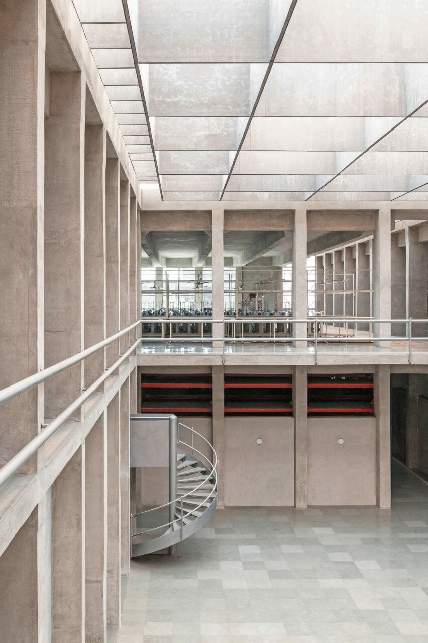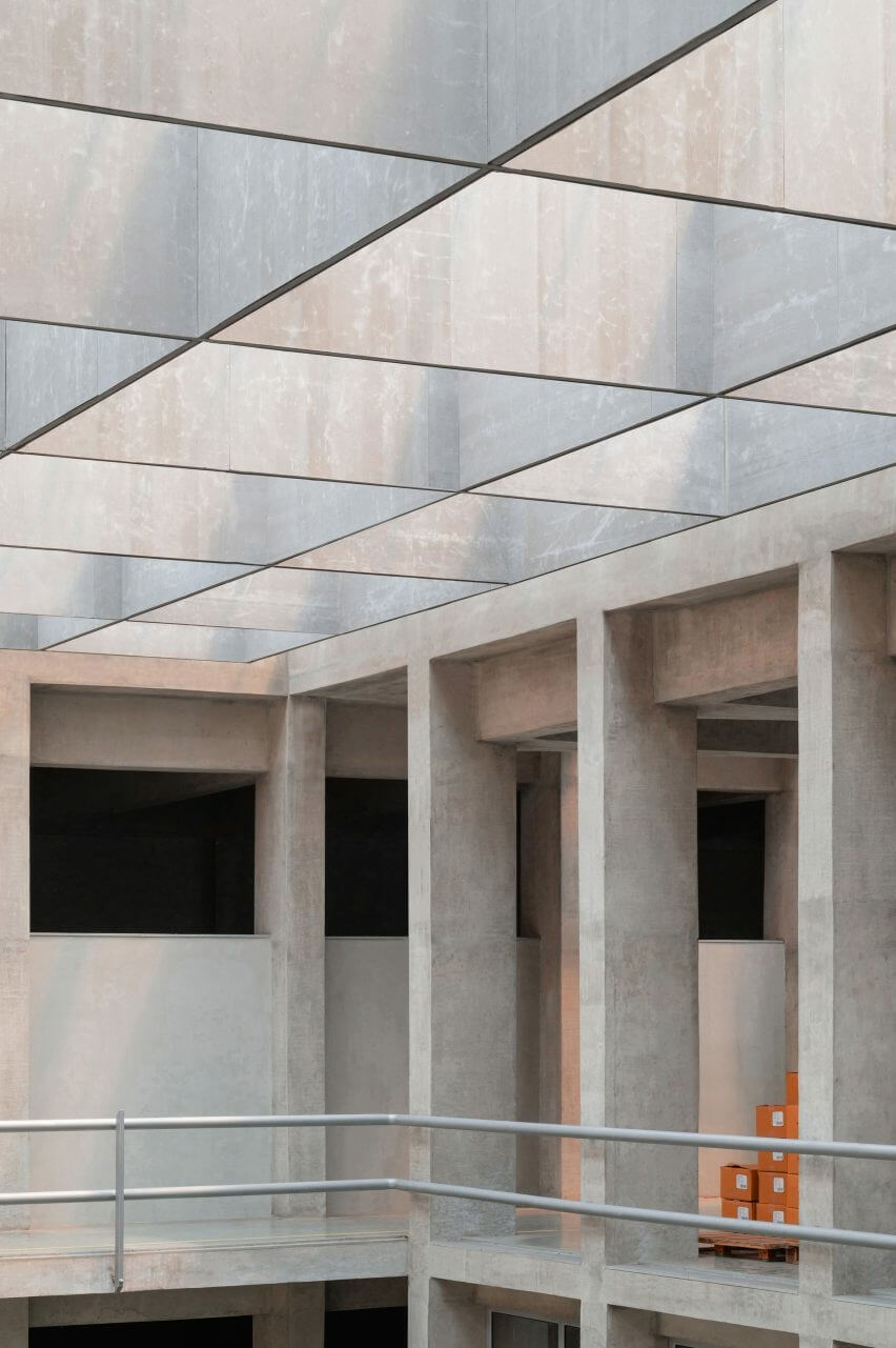 The studio left the materials and structural elements exposed and unfinished across both the exterior and interior, to create an efficient facility that celebrates raw material. The building was then divided into four structurally independent spaces that circle around a central atrium, where a skylight, protected by a steel frame, bathes the areas in natural light.