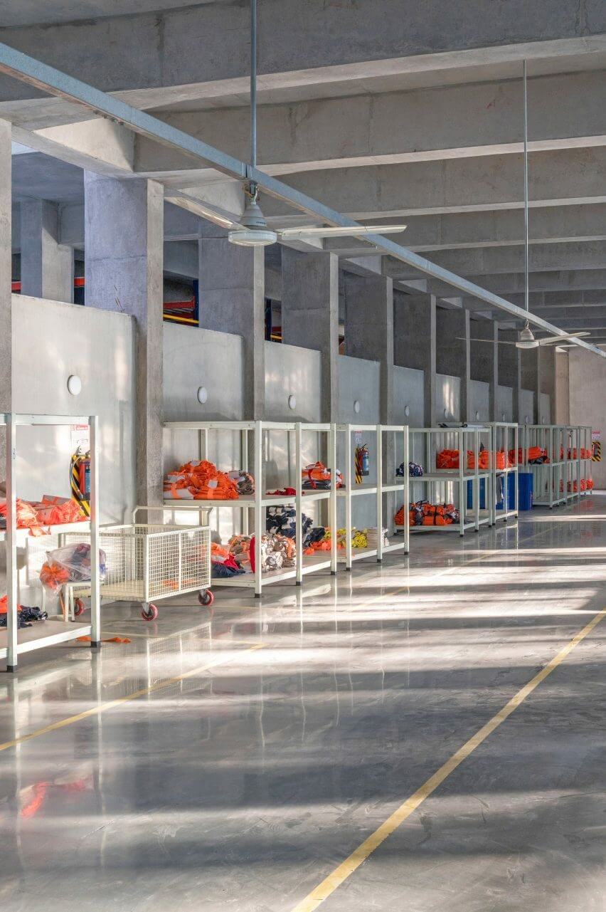 The offices or admin spaces are on the ground floor while most of the work areas are on the upper level of Mallcom Factory. Spread throughout the interior, rooms, and corridors are a series of concrete columns and polished concrete floors. The gaps between the columns around the atrium have metal railings stretching across the openings to create balconies that overlook the level below. Meanwhile, concrete walls fill the other gaps in other places.