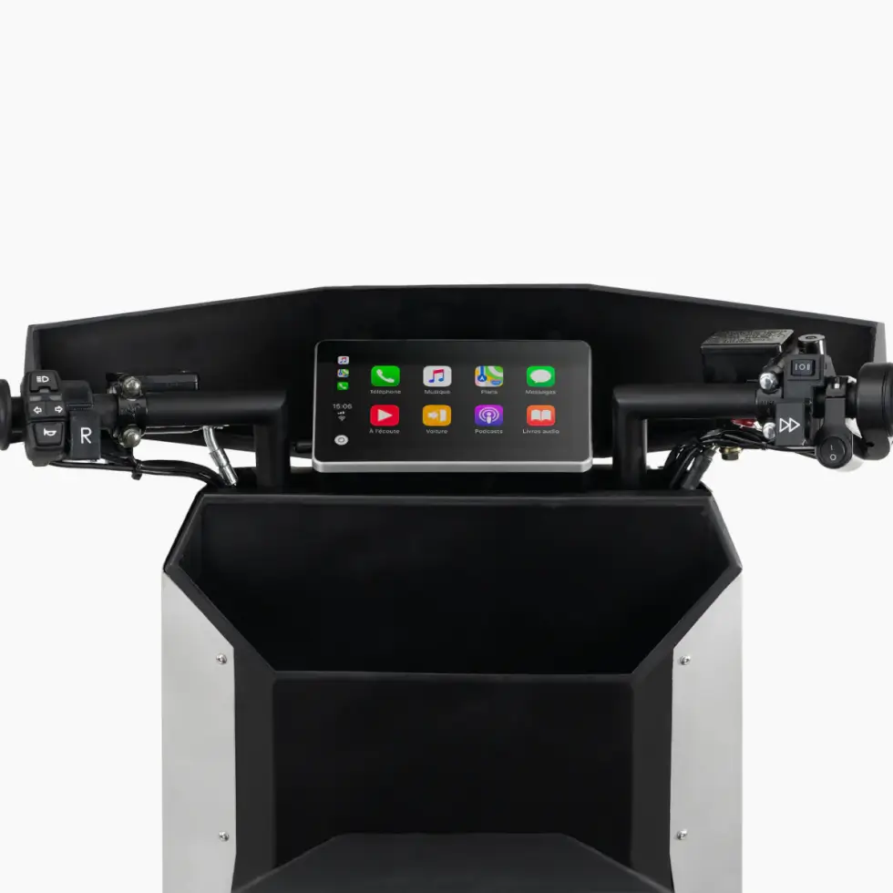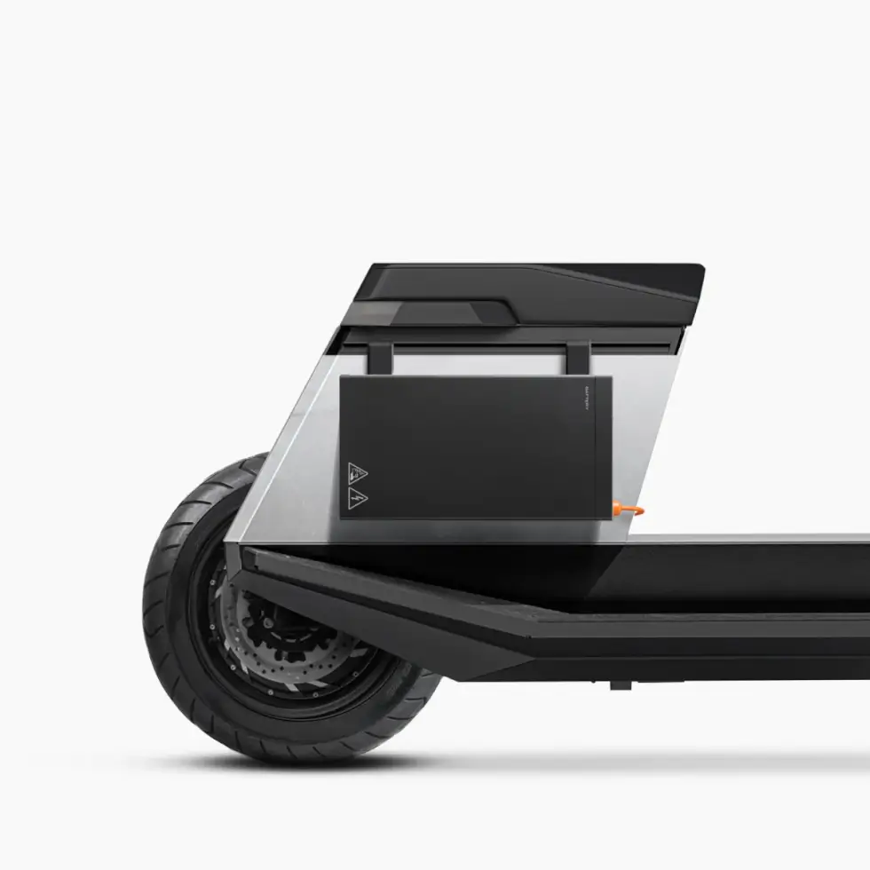 By default, the P1 is outfitted with a 6 kW hub motor powered by two removable 72V 30 Ah batteries. The setup allows the electric scooter to hit a top speed of 55 mph and a maximum range of about 60 miles. A large touchscreen positioned between the handlebars can display the instrument panel and access other useful functions. For added security, the theft prevention system immobilizes the electric scooter when it detects unauthorized access.