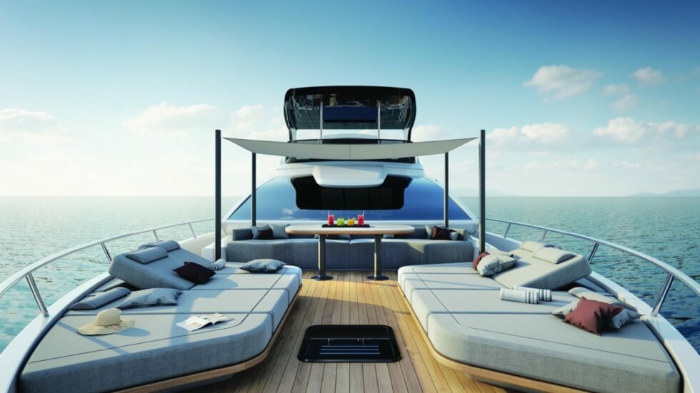 Intermarine offers various configurations to choose from. The flybridge can have more seats or a jacuzzi with sun pads. What follows is the main deck, where fold-out sections provide more space for leisure activities and socializing. An open indoor floor plan includes a living area, day head, dining area, galley, and the helm.