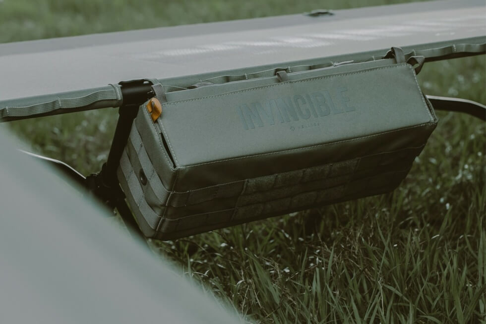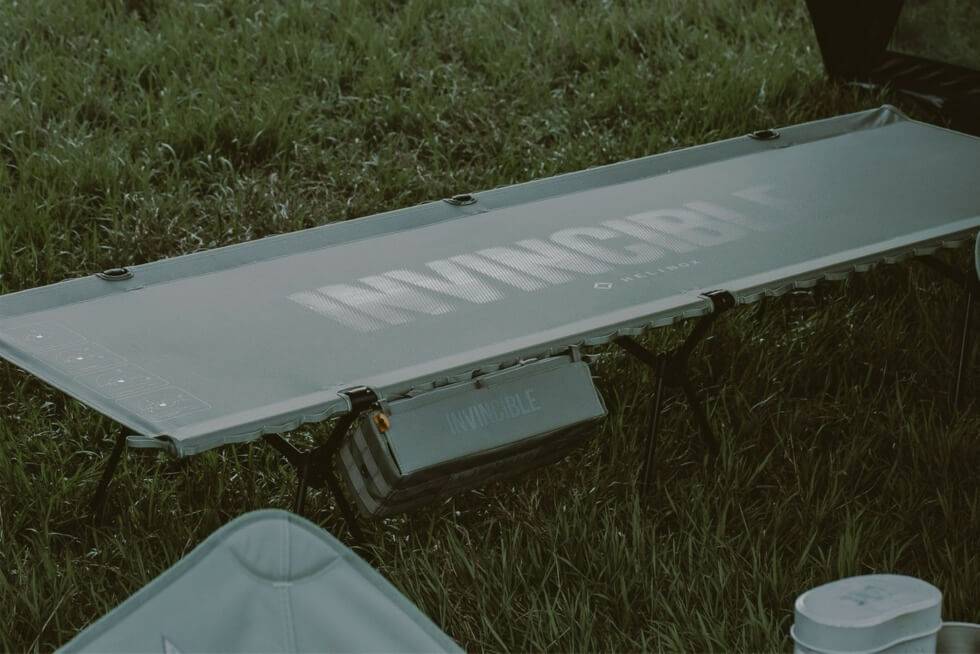 The line comes with outdoor gear from Helinox’s Tactical Line. This includes a grey Tactical Cot with convertible legs. It has a reflective print that represents the INVINCIBLE x Helinox branding and a sun track pattern detail on the side. Then there’s the redesigned Tactical Chair in nylon fabric with mesh for breathability.