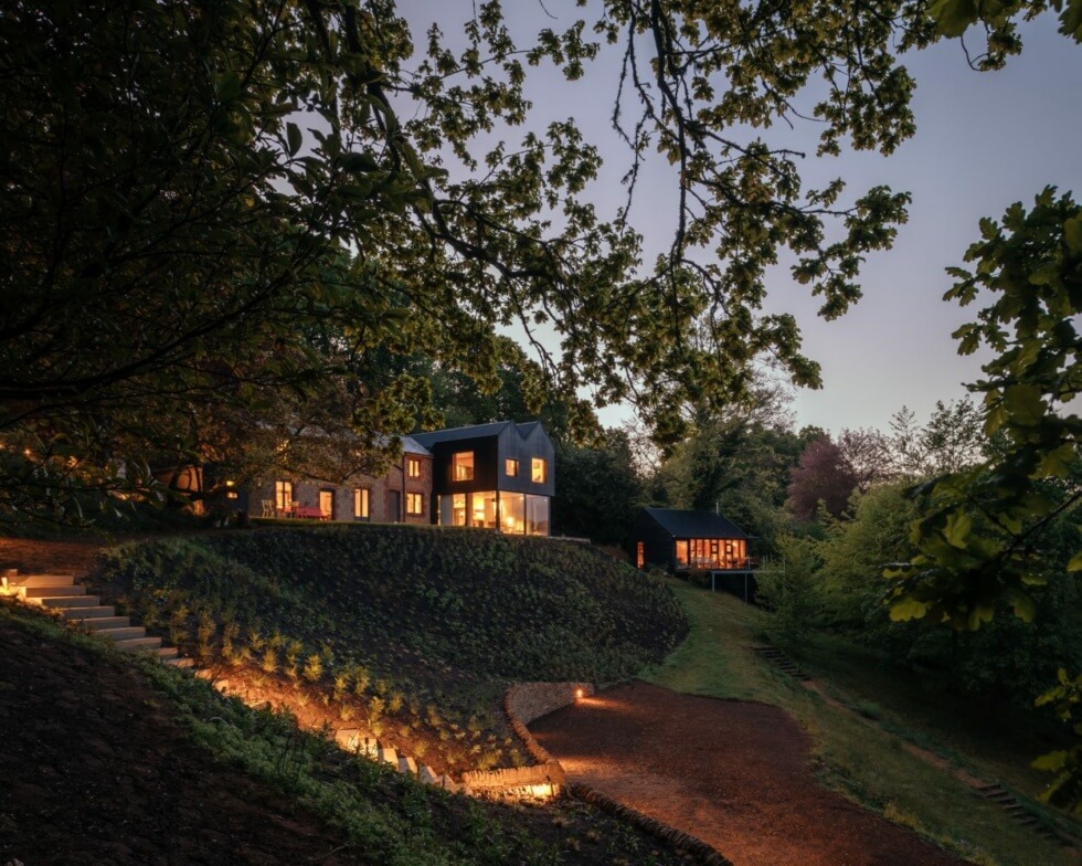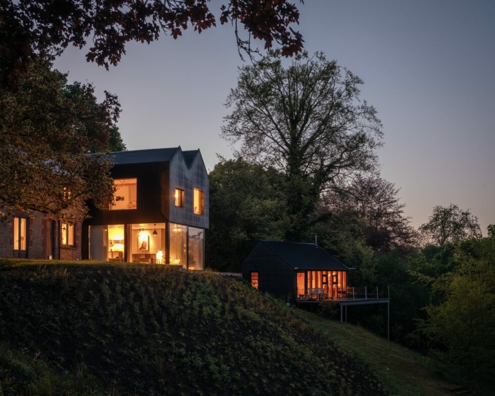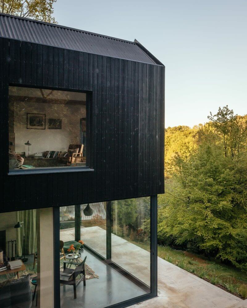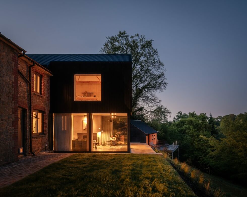 In contrast to the original earthy stone façade, the new building is distinct courtesy of dark wood cladding. Natural lighting fills the volumes by day courtesy of large windows on the top floor while the living space below features sliding glass doors.