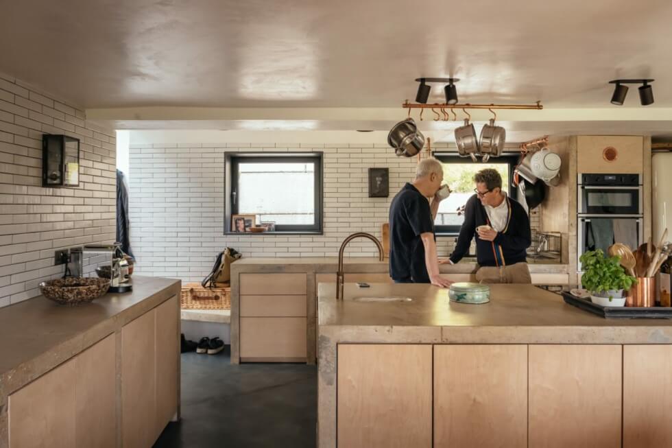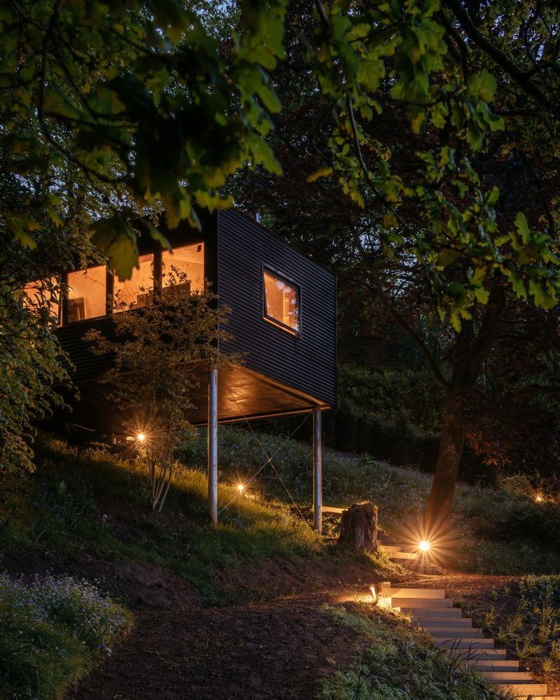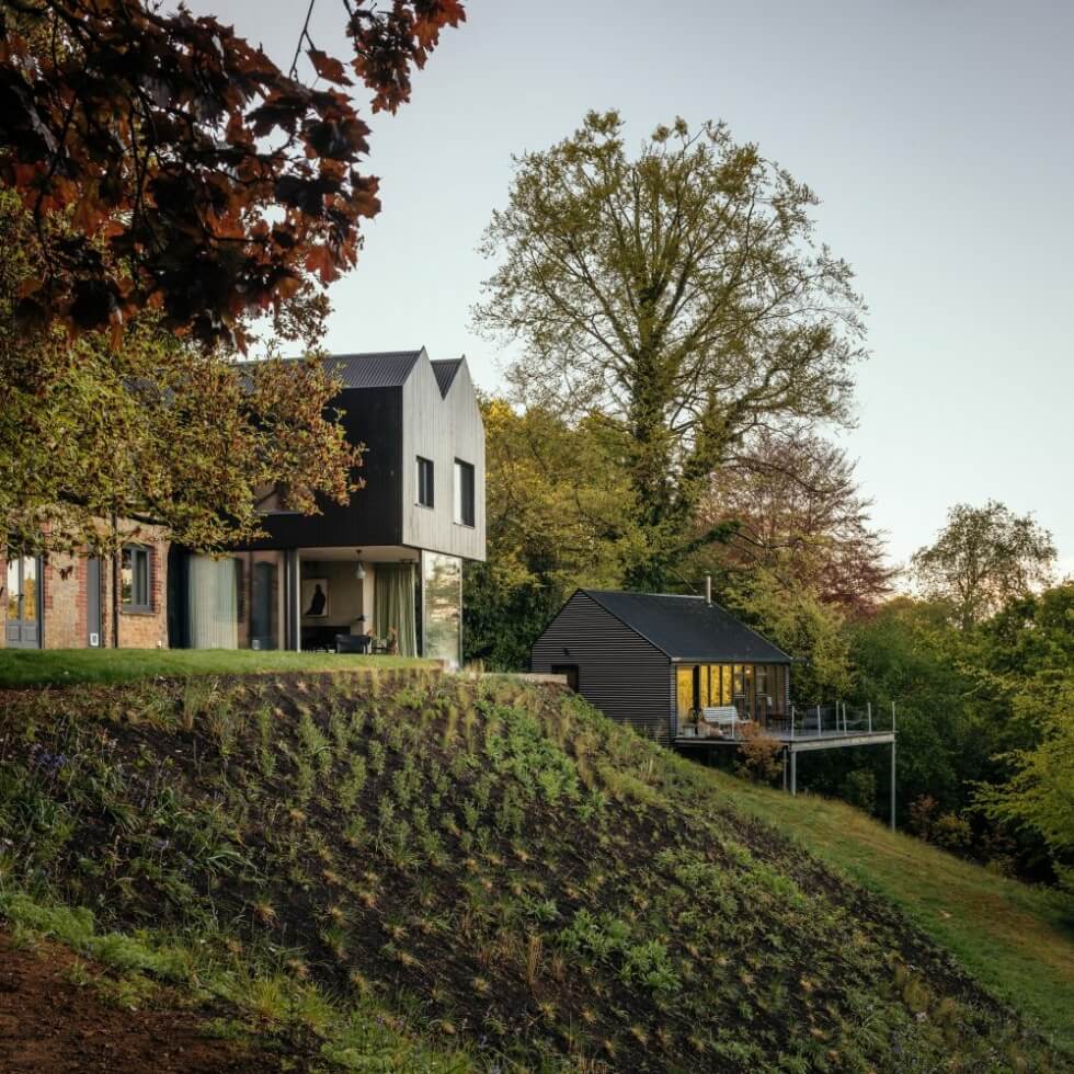 Meanwhile, Invisible Studio constructs two detached volumes to function as offices for the owners. The unit on the steep drop features a flat roof, while the other touts a pitched cover. These allow each resident to focus on their respective creative works.