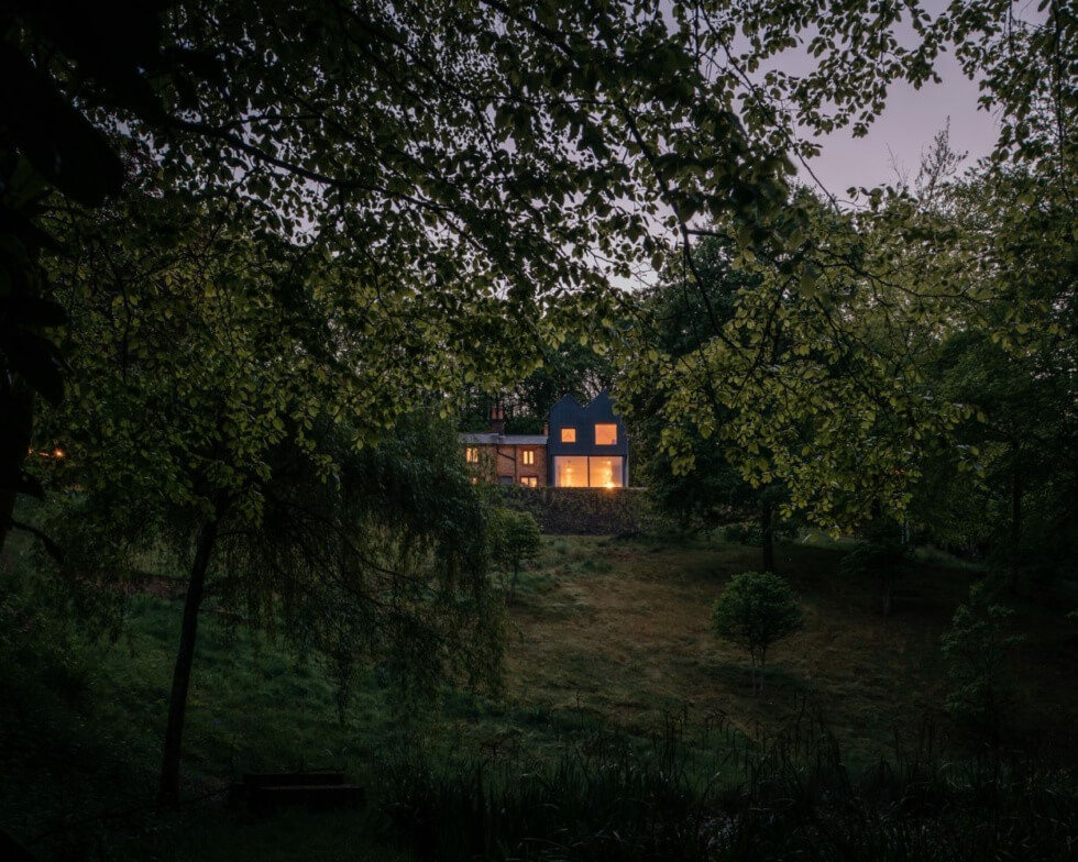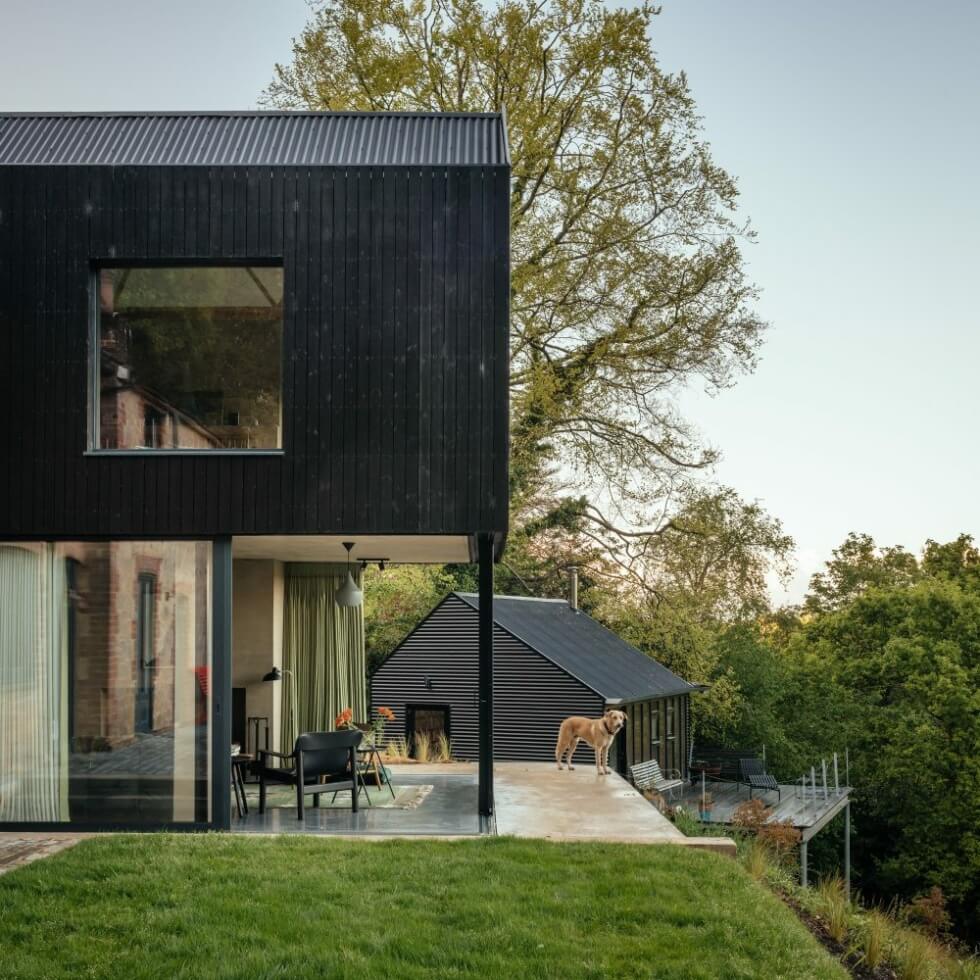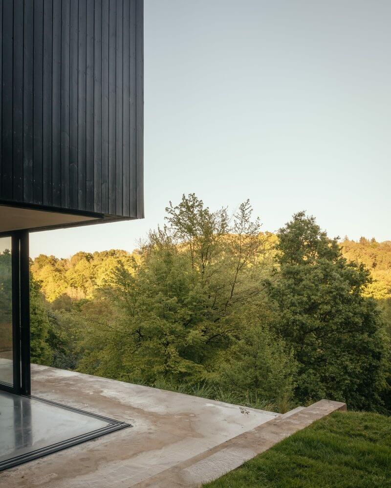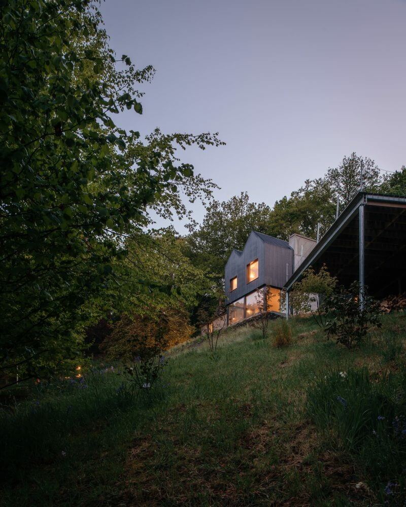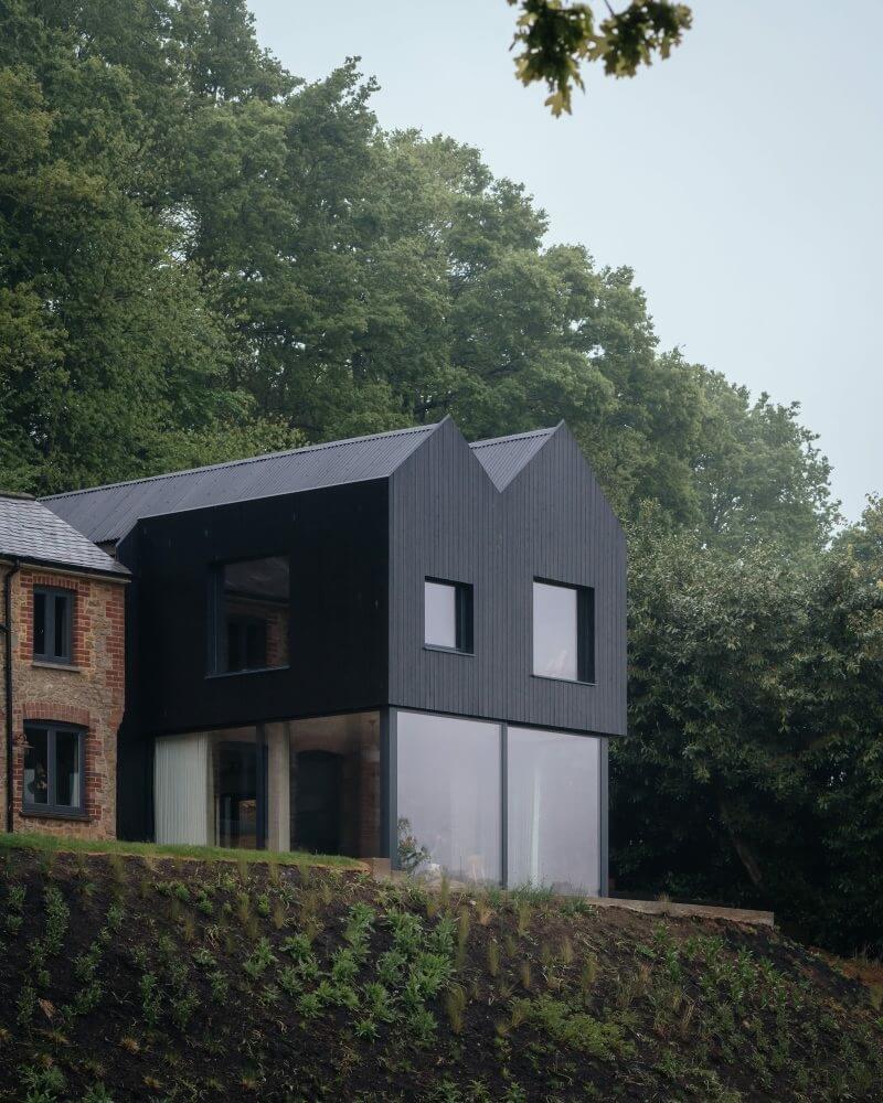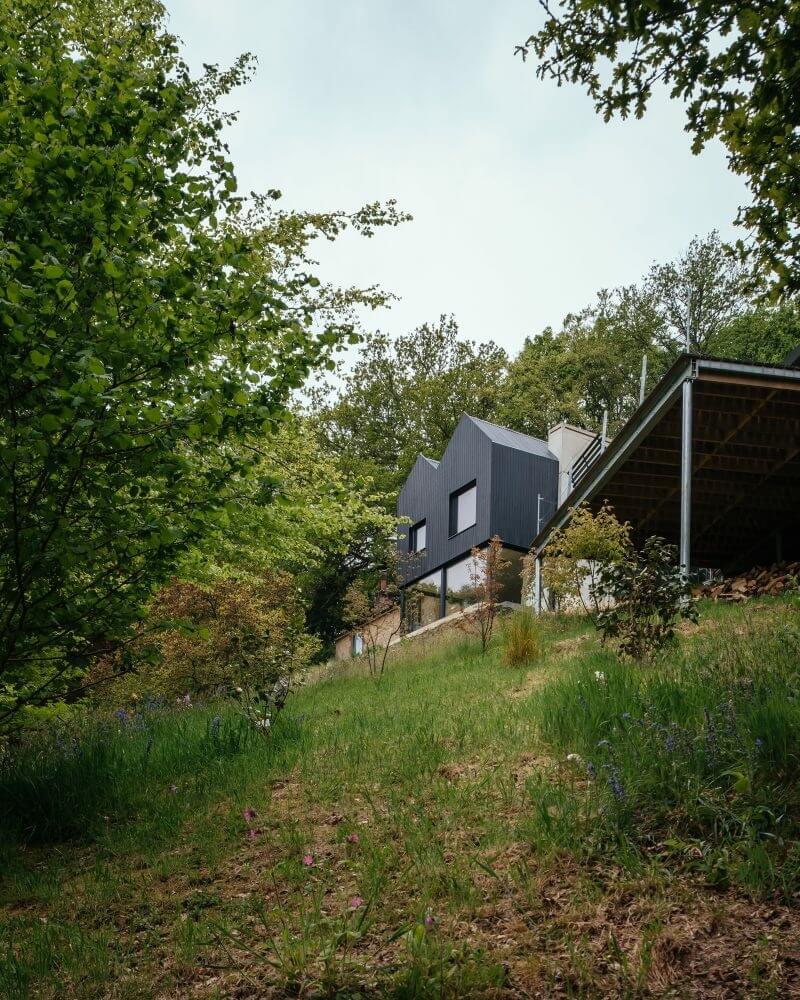 Before any work could start, Invisible Studio surveyed a sloped terrain with a double-pitched roof house. After some consideration, the team opts to keep the structure intact and integrate an extension instead. The two-story add-on also mimics the roof outline but stands perpendicular.