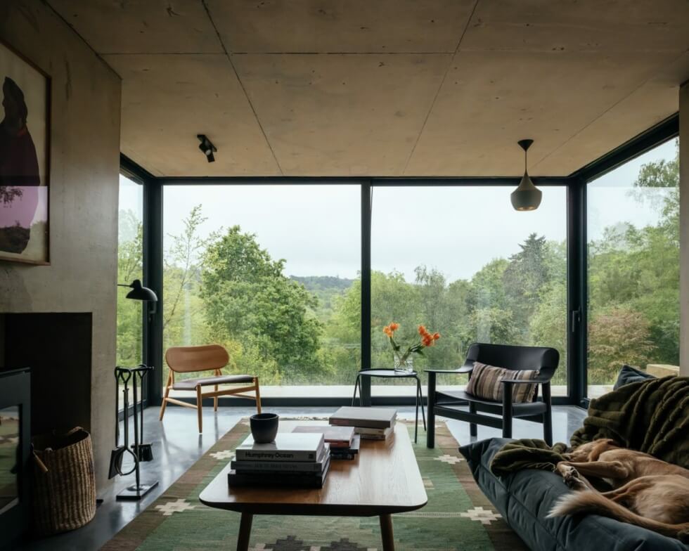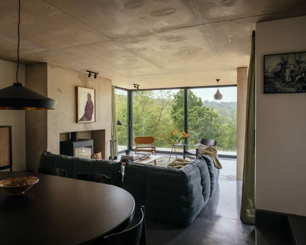 When open, it connects the interior to the patio. Invisible Studio keeps the color palette neutral via exposed concrete, steel, and plaster. The interiors beckon you to stay and enjoy the warmth of the fireplace when it gets cold outside. The ceilings right under the roof keep the timber trusses visible.