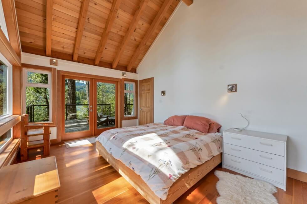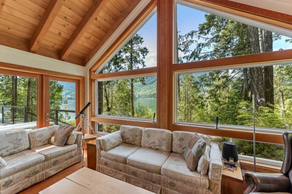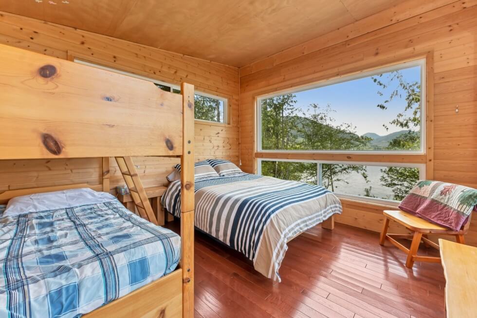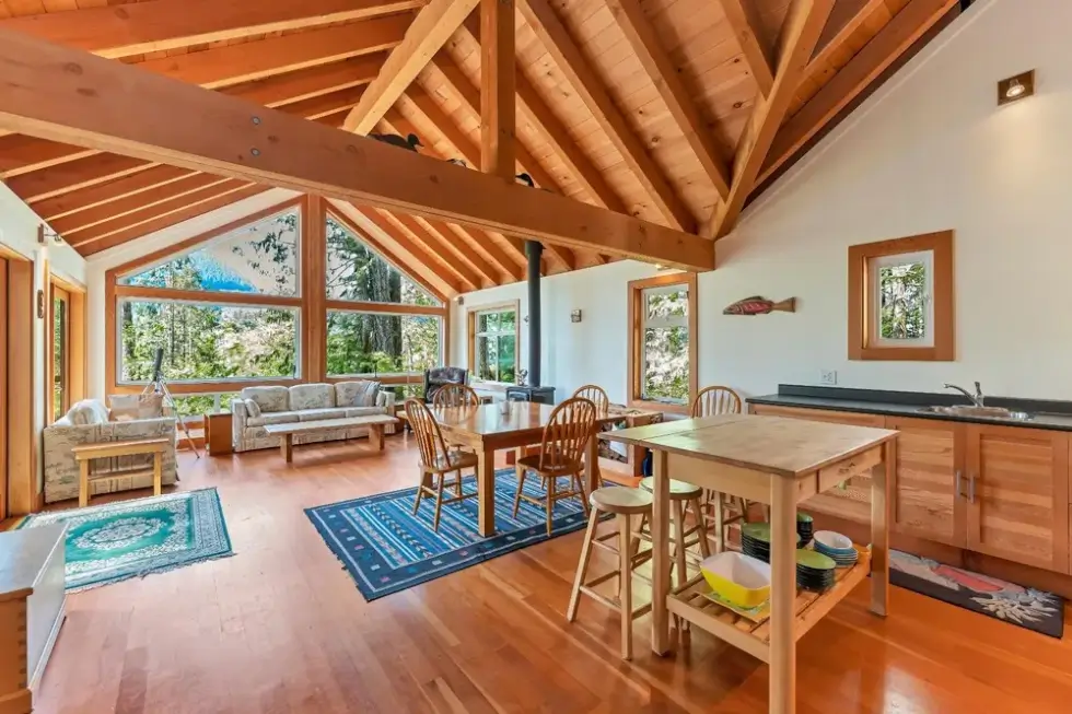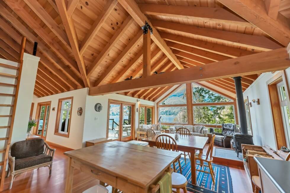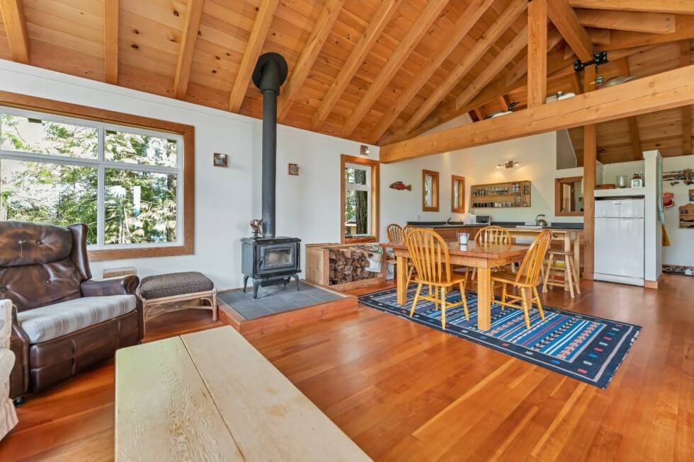 The sale also includes a 1,500-square-foot West Coast-style home that’s fully-furnished and can accommodate ten people. The home is modern and comes with all the necessities needed for a comfortable stay. It features vaulted Cathedral ceilings and exposed beams, high windows, and has a large great room that provides incredible views of the mountains and Cowichan Lake, which is about a 90-minute drive from Victoria.
