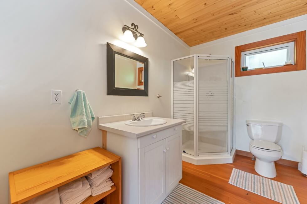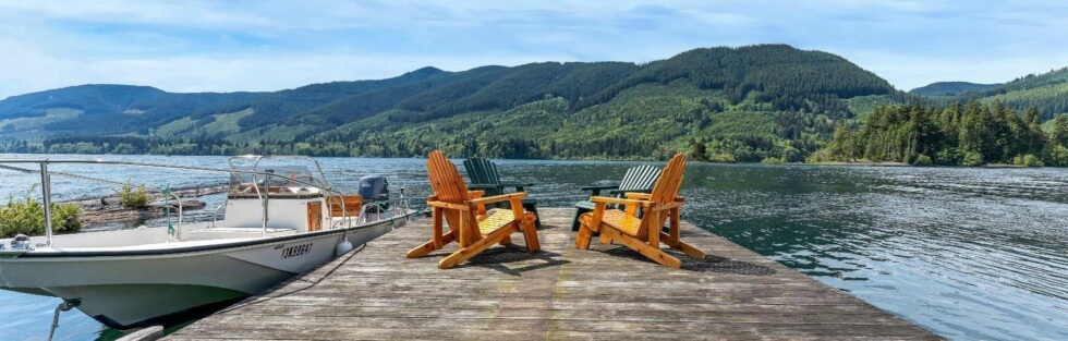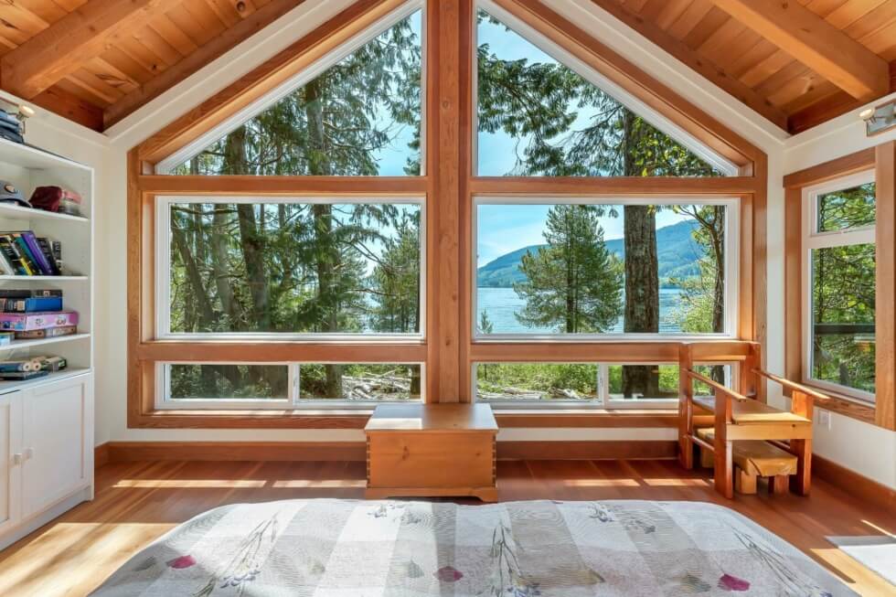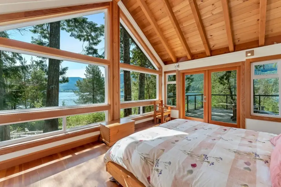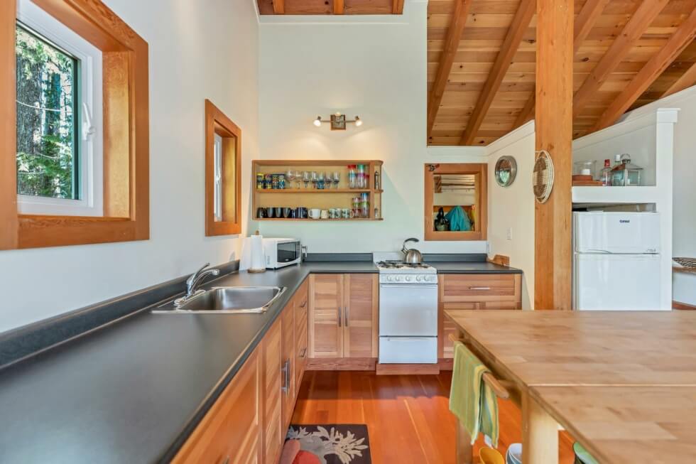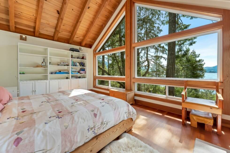 The sale also includes a 1,500-square-foot West Coast-style home that’s fully-furnished and can accommodate ten people. The home is modern and comes with all the necessities needed for a comfortable stay. It features vaulted Cathedral ceilings and exposed beams, high windows, and has a large great room that provides incredible views of the mountains and Cowichan Lake, which is about a 90-minute drive from Victoria.