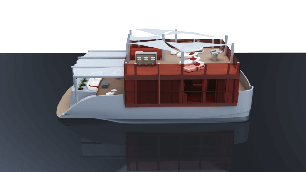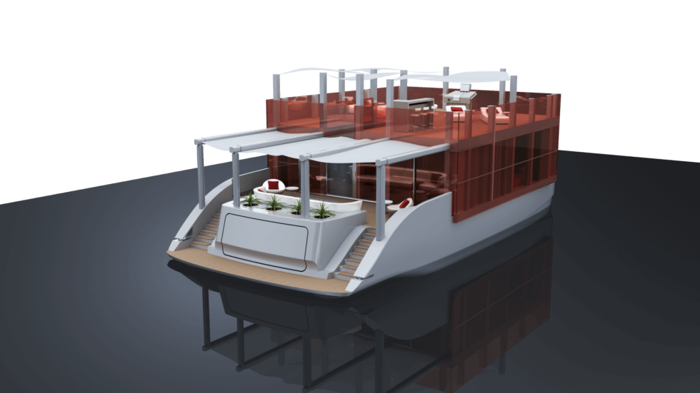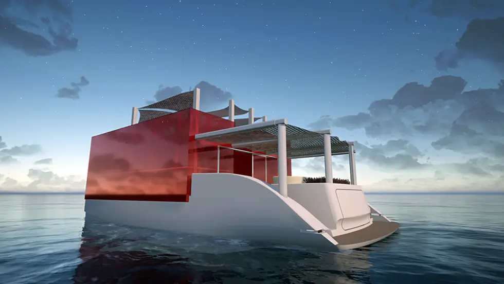 The structure or “Cubic House” as Leoni calls it, also showcases red reinforced glass. It’s a floating home concept that beautifully marries architectural artistry with marine engineering. It was inspired by the pioneering creations of the modernist movement and the work of Swiss-French architect and designer Le Corbusier.