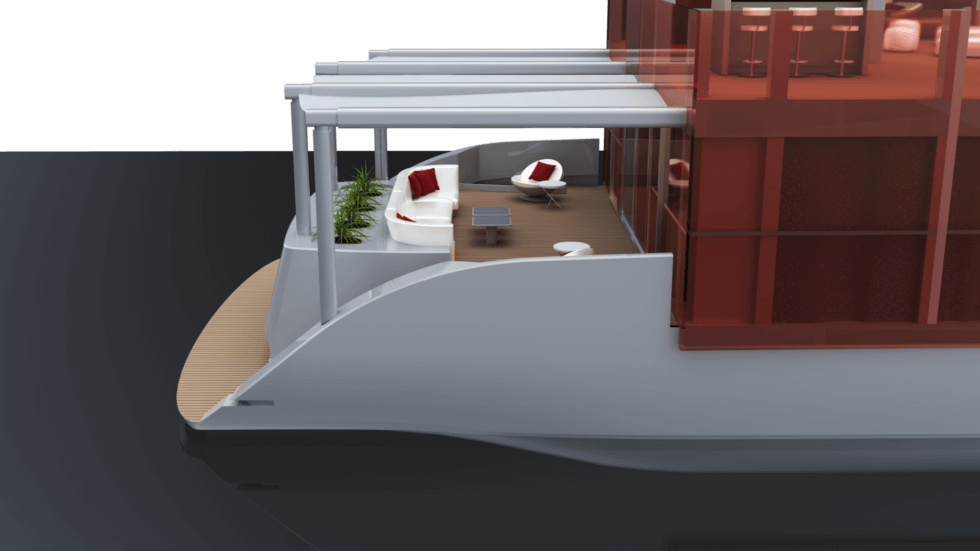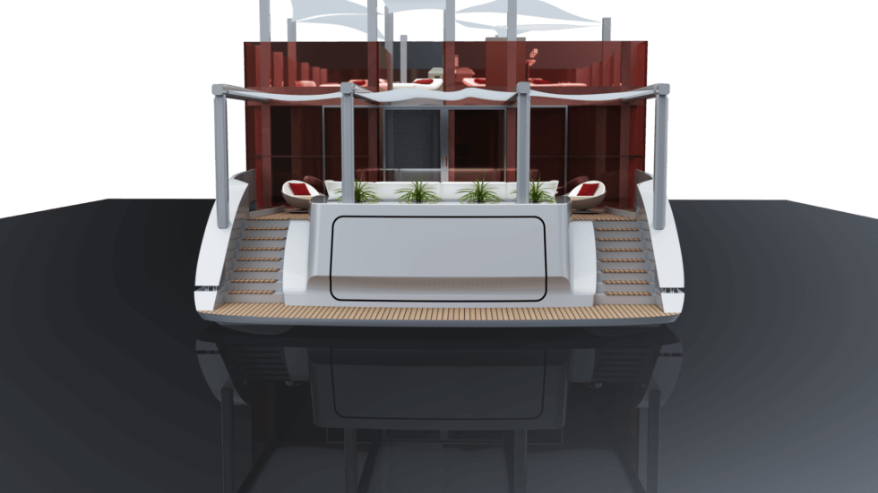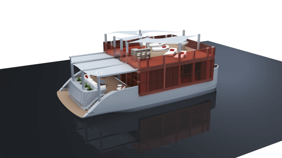 Italian designer Jacopo Leoni has reimagined the humble houseboat into a super-structured, highly-designed luxurious home equipped with a jacuzzi and a swimming pool. His concept called Cube Houseboat, is an angular vessel built on a robust aluminum catamaran as its foundation featuring slightly curved and asymmetrical displacement hulls.