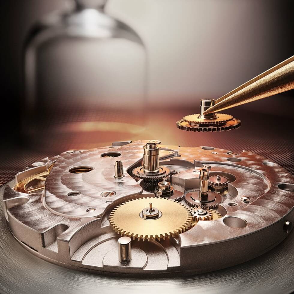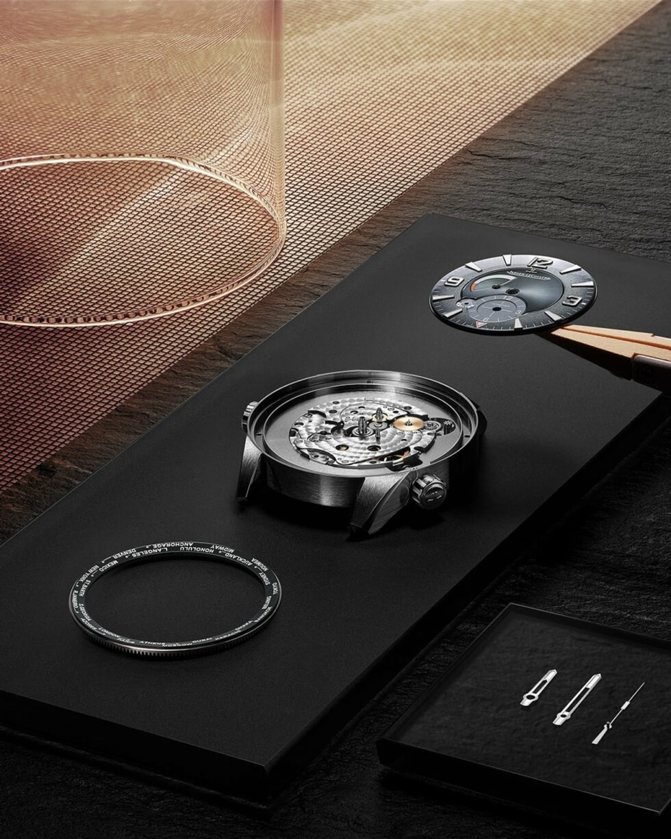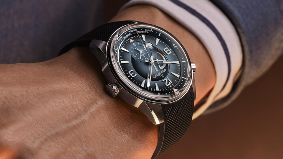 The ocean gray dial is a textural delight as Jaeger-LeCoultre combines opaline, sunray, and matte surfaces. According to the official description, it “is composed of almost 40 steps.” Skeletonized stick hands with lumed tips indicate the primary time zone via Arabic numeral and trapezoidal hour markers.