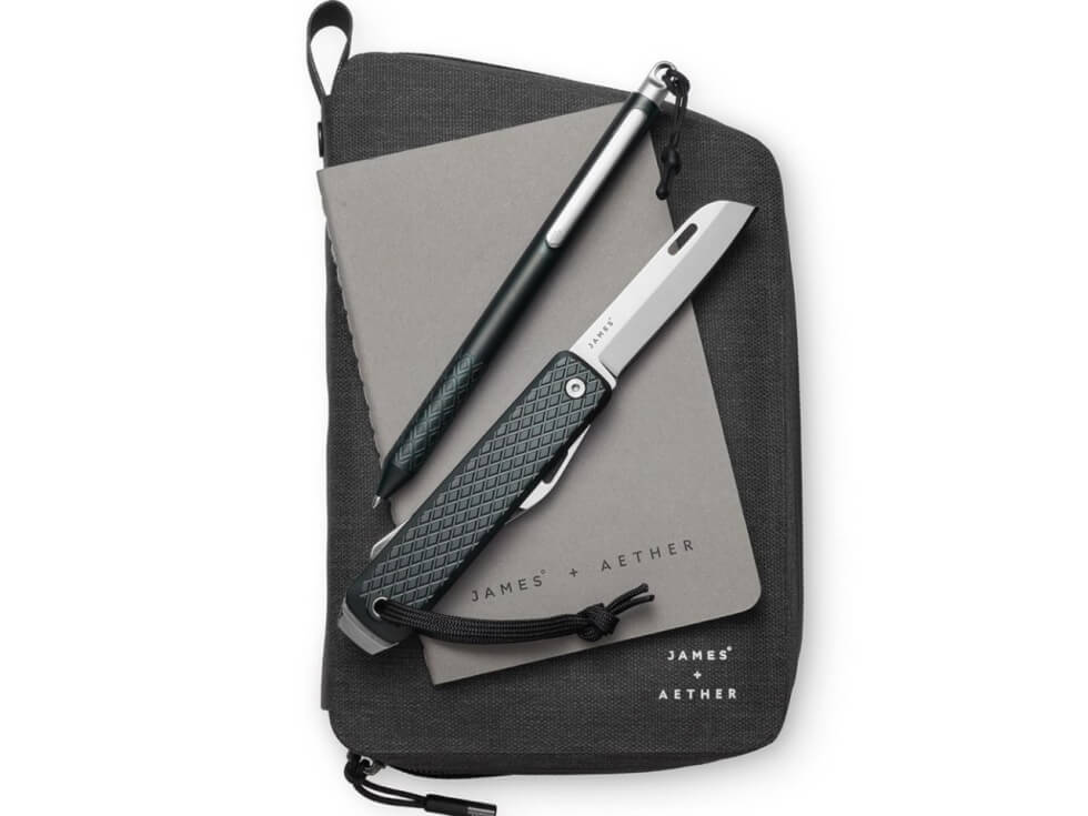 This EDC kit comes with a limited-edition pen and knife and both feature a diamond-patterned grip for ease in use. They also have dedicated handle or string holders. This allows you can carry them separately with your keys or hang on your belt loop. The kit also comes with a James + AETHER-branded Moleskine notebook to match the pen.