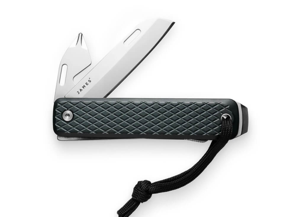 Designed for functionality and ease in travel, the pocketknife sports a 2.5” locking blade, a bottle opener, a Phillips-head screwdriver, and James’ “All Things” scraper and pry. The lockback design ensures safety at all times even if you apply a lot of force on the blade.