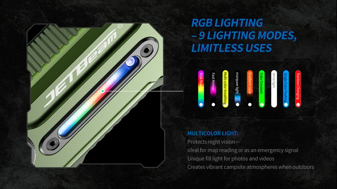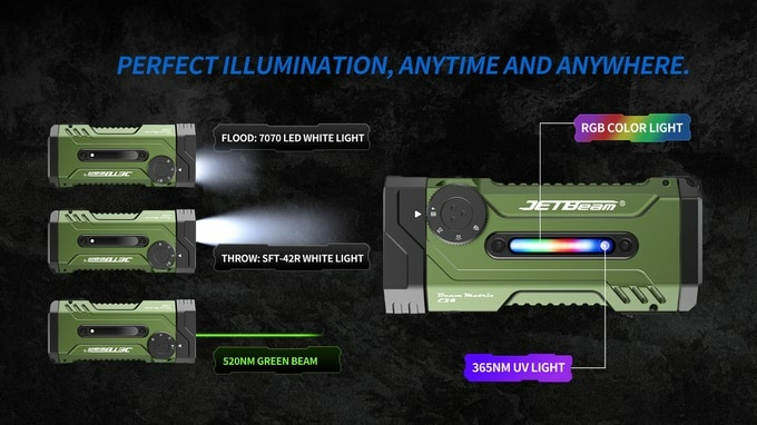 This is an all-in-one flashlight offering a sleek and modern design along with equally modern features. It is a power bank and packs various illumination for different tasks or scenarios. It has a floodlight, a spotlight, a 365nm UV light, a green laser pointer, an RGB color light strip, and even has a sidelight ambient light.