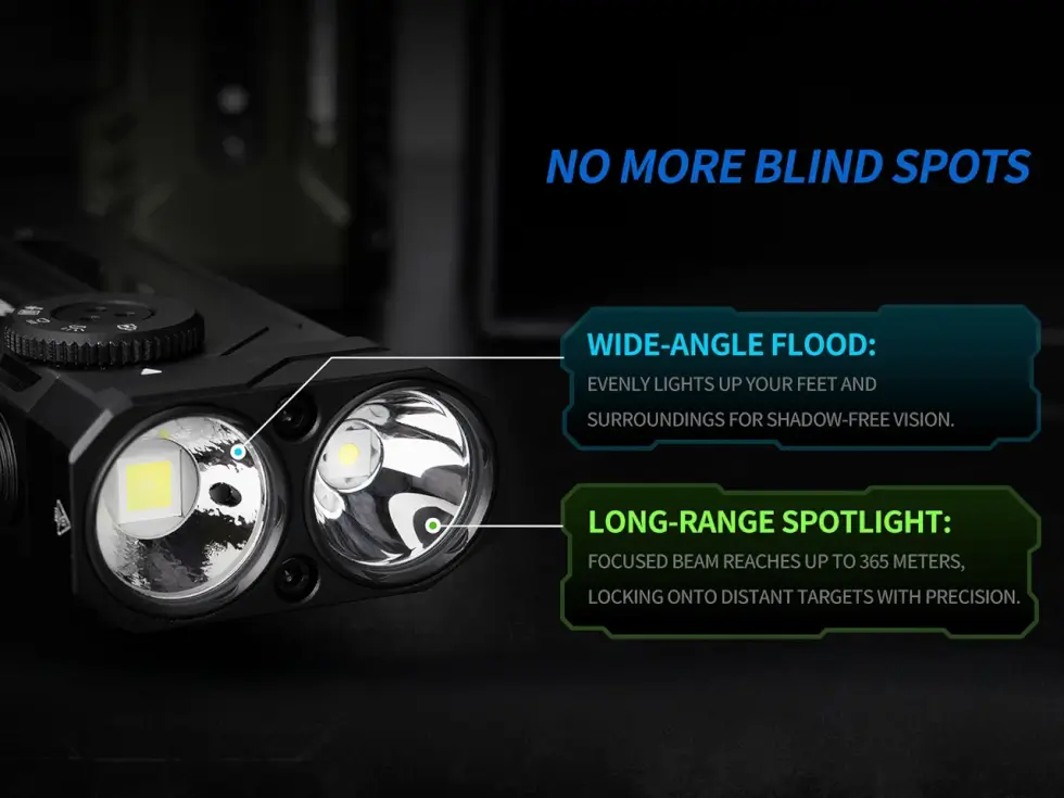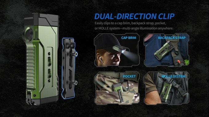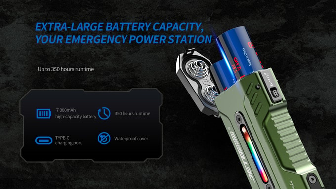 Moreover, an extension port at the back offers hands-free use. It attaches the flashlight to its included clip, or to a bike or GoPro bracket. This flashlight runs on a removable USB-C rechargeable 7,000mAh battery that fully charges in five hours. A color indicator provides the real-time battery power.