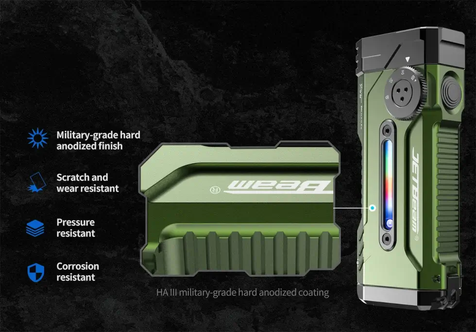 It flashes red if the battery is below 10% and orange when it reaches between 10% and 34% during charging. The light flashes green between 35% and 95% and turns solid green when 95% or above. The battery has a runtime of 350 hours. The JETBeam E28 is IPX8 waterproof and built tough to withstand years of use and abuse with aerospace-grade aluminum with HA III hard anodizing.