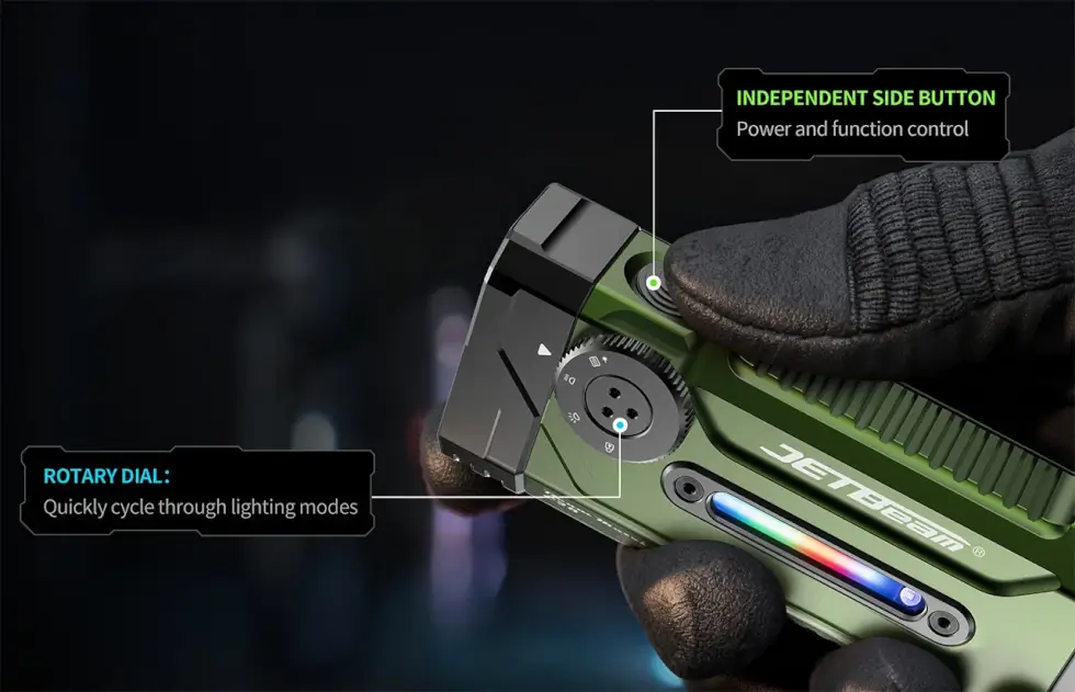 The JETBeam E28 offers easy one-handed operation via the side control and rotary dial. The latter lets you choose the light modes and the LOCKOUT, which cuts out all power with a single dial. Then the side button powers the flashlight on or off and toggles through the different output levels, the RGB light, UV light, and green laser pointer.