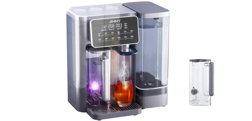 JIMMY R9 Countertop RO Water Purifier features a mother-and-infant-grade, seven-stage purification system with 0.0001-micron RO reverse osmosis and UV sterilization lamp at the rear of the 5L water tank. This advanced process removes 99.99% of bacteria, heavy metals, PFAS, and other harmful substances. It is also enhanced with coconut shell activated carbon to deliver water that tastes as fresh as spring water.