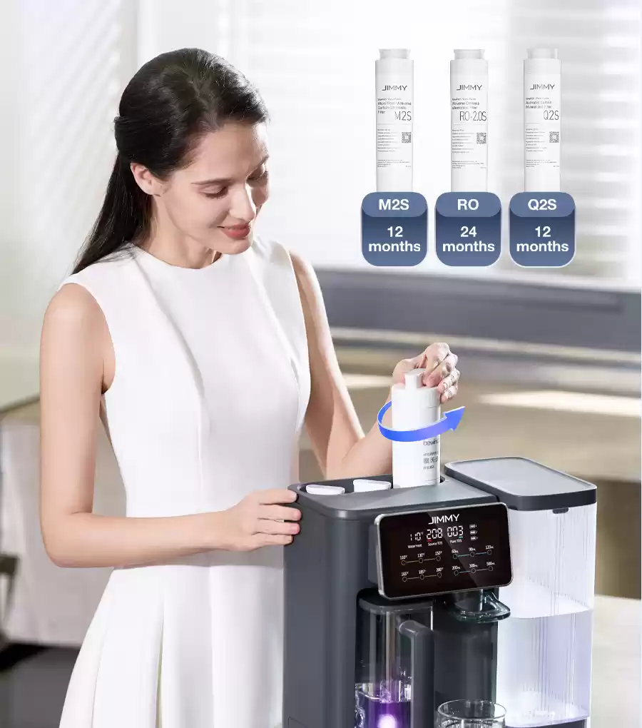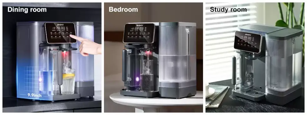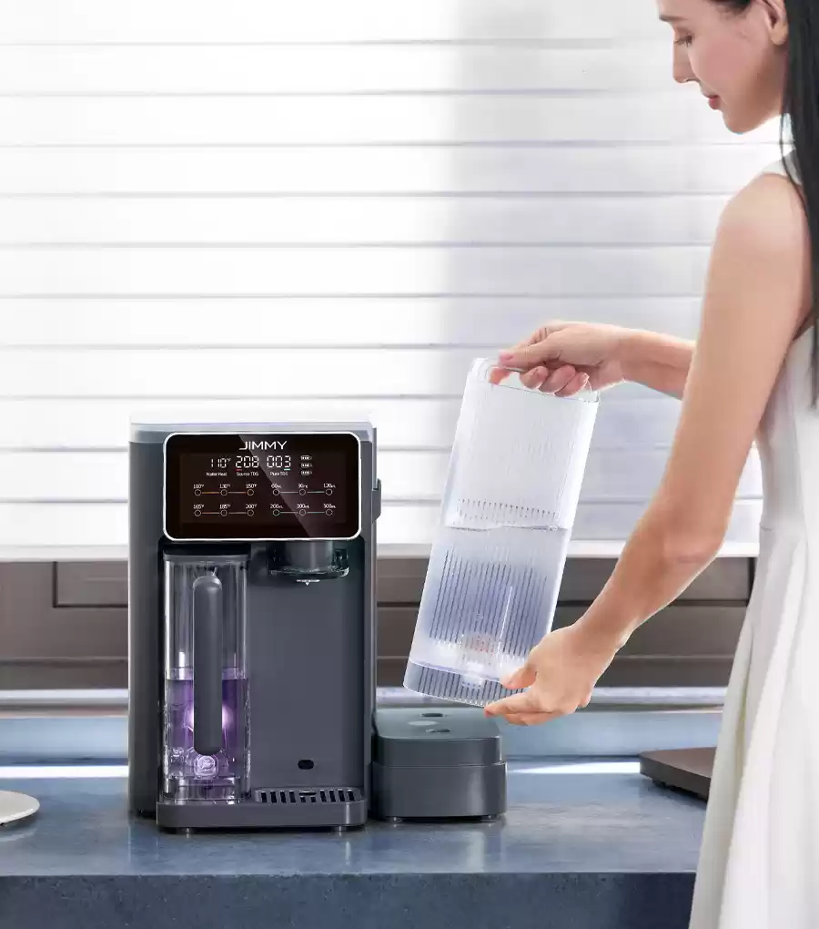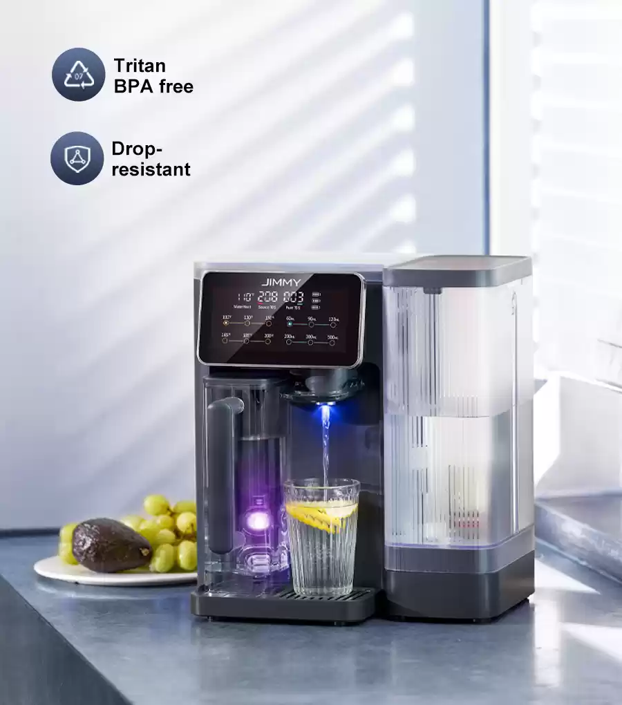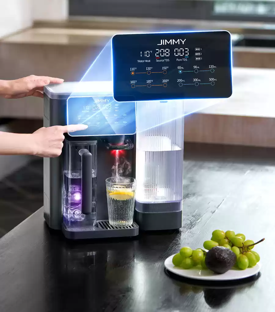 JIMMY R9 Countertop RO Water Purifier features user-friendly smart touch controls for effortless selection of both water temperature and dispensing quantity. It also stores personalized settings for future use, shows the filter life status and the real-time monitoring of TDS values before and after purification. Meanwhile, thoughtful features include a child lock to prevent accidental activation and the ergonomically positioned side tank for easy refills.