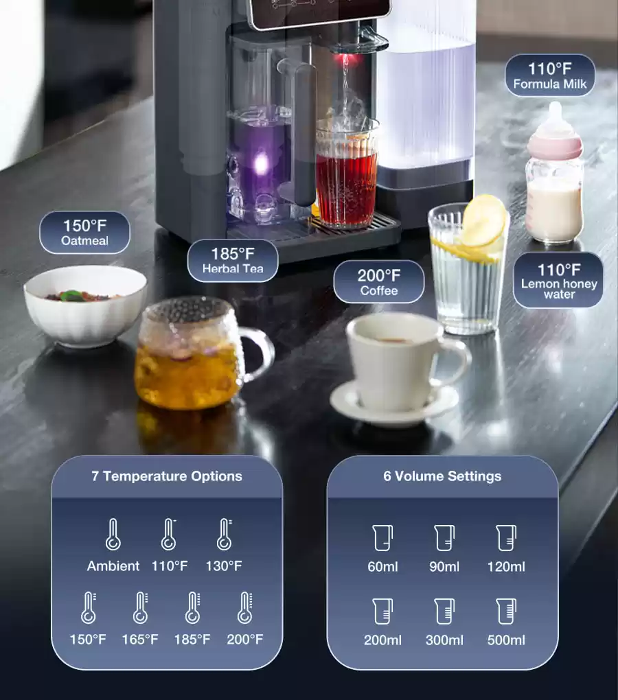 Moreover, it offers precise quantity and temperature control from room temperature up to 200°F using advanced three-second rapid heating technology. It integrates seven customizable settings to cater to various beverage needs from coffee, hot tea, to milk frothing.