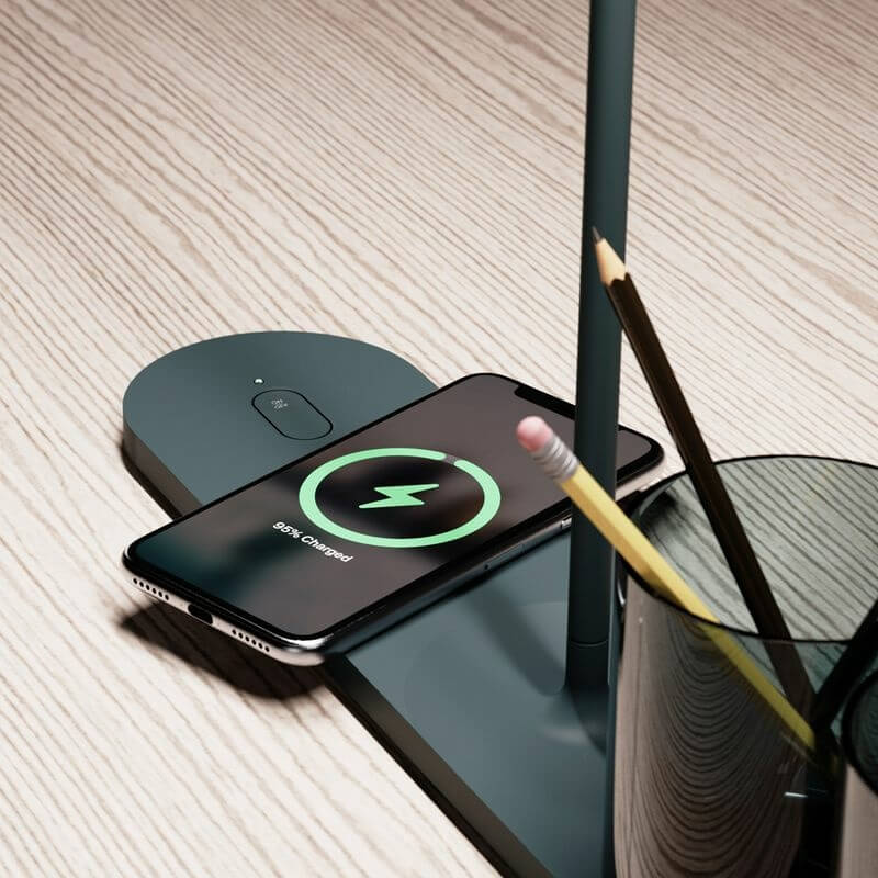 Jones & Partners’ Current Desk Light comes in two versions. The first comes with the wireless charging surface on the left side of the lamp’s base near the power on/off button. Meanwhile, the second has a portion of the base hidden beneath the tabletop for a flush and neat appearance on the mounted surface design, which conceals a larger plug-in unit that enables two interchangeable charging modules to be switched out or added as needed.