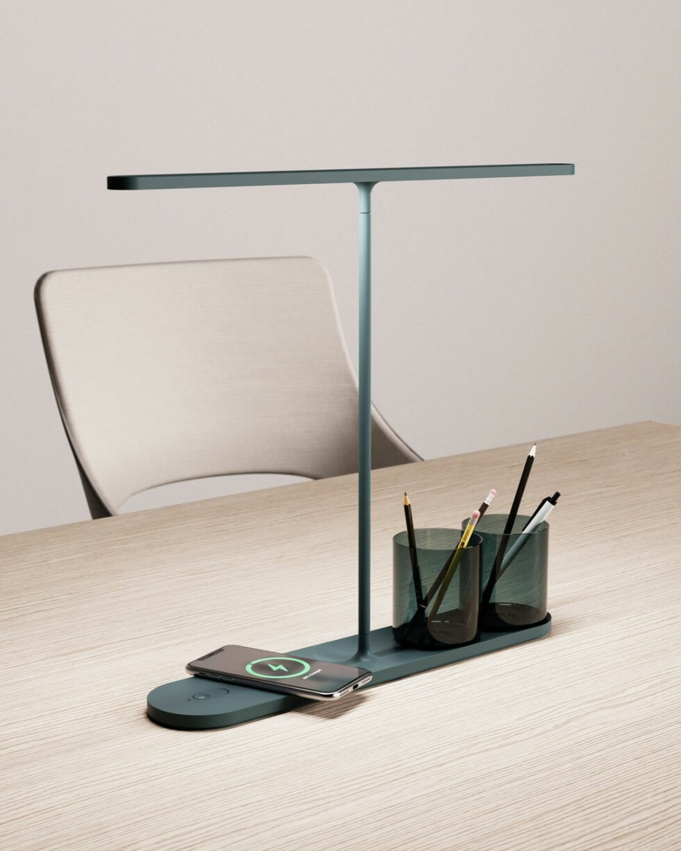 It bridges the world of contract furniture market and the electronic design scene. The result is an elegantly realized modular task or desk lamp that not only offers illumination, but also storage for stationary and various charging ports. These include a QI-wireless charging pad, a USB port, and the option to add more outlets in a single minimalist yet functional form factor.