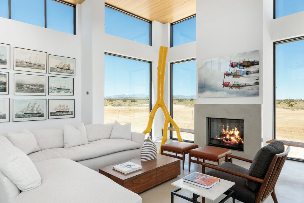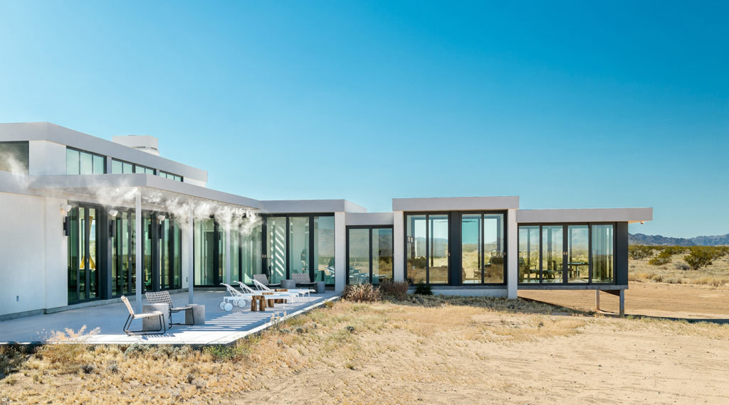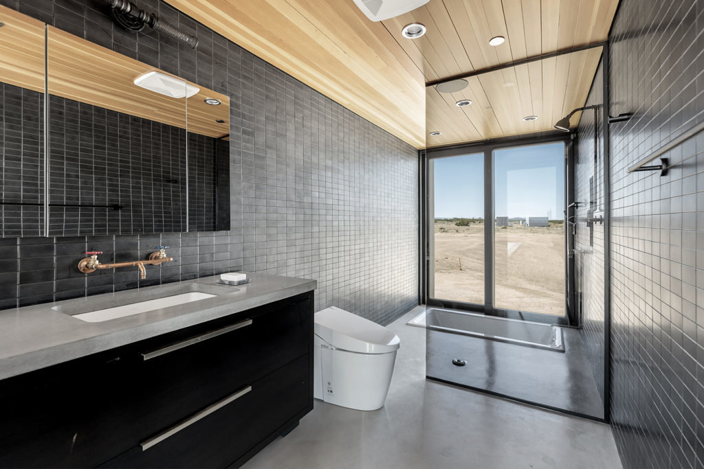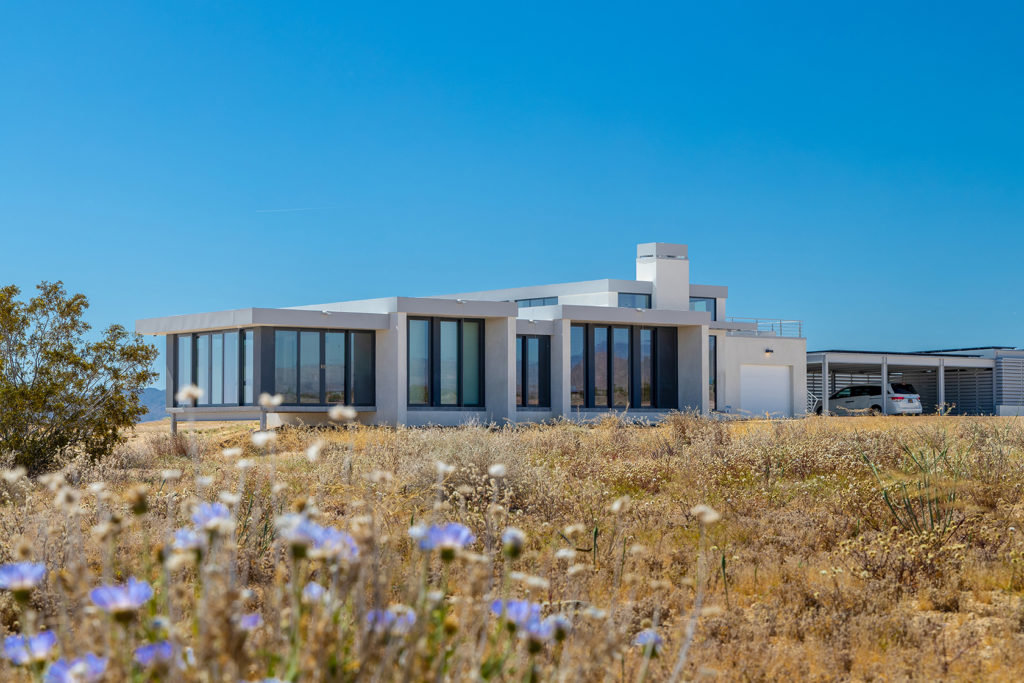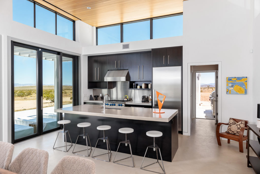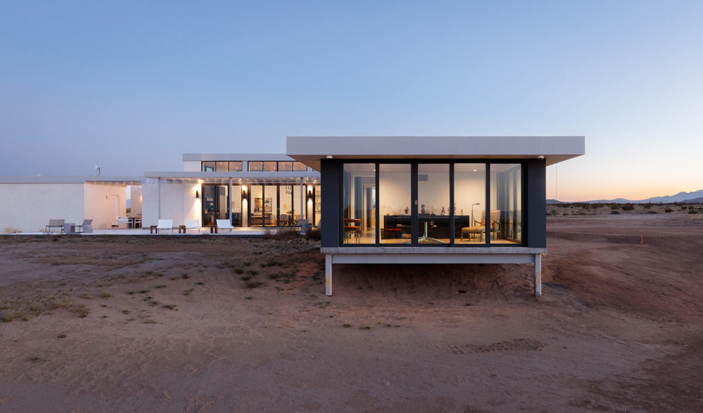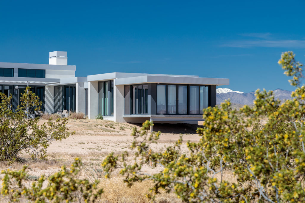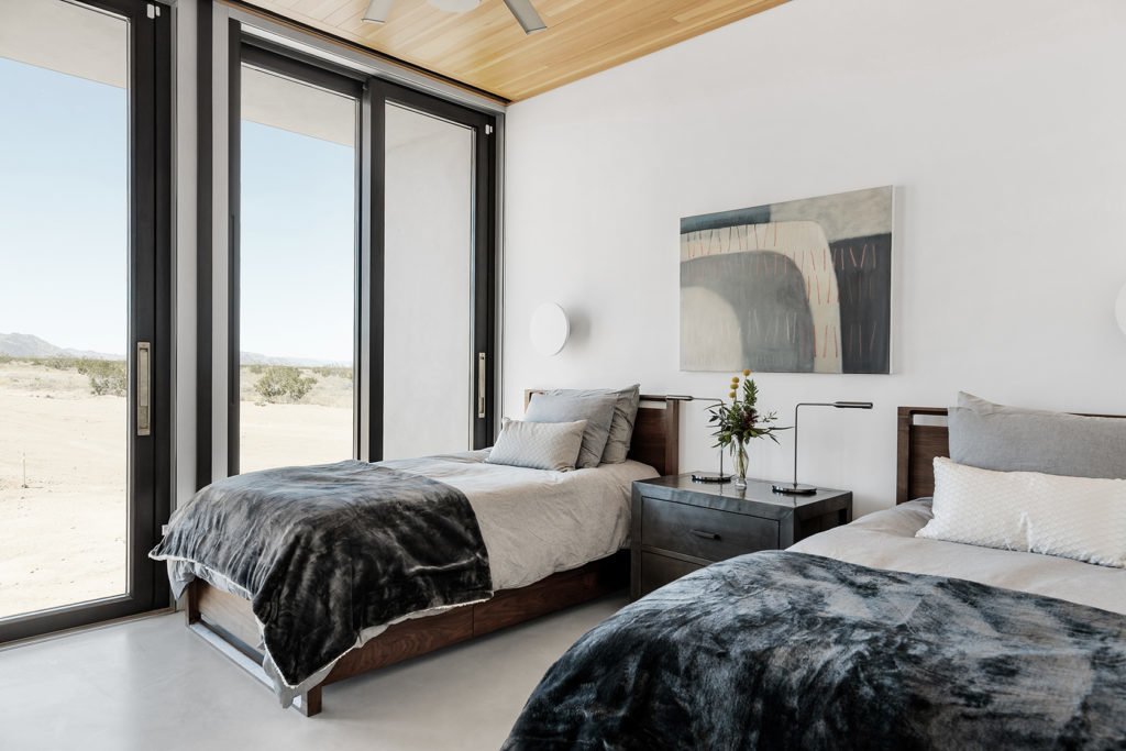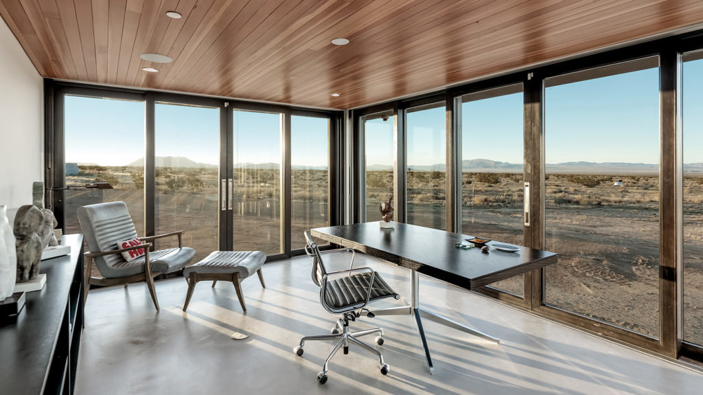The Joshua Tree Desert Retreat sits on a sandy plot. Inside, you’ll find an office area that cantilevers over a natural slope, propped up thanks to a foundation of stilts. Glazed windows that span from the floor to the ceiling let light in, and also offer a spectacular panoramic view of the mountain landscape enveloping the house. The concrete facade offers protection from the harsh sun and wind.