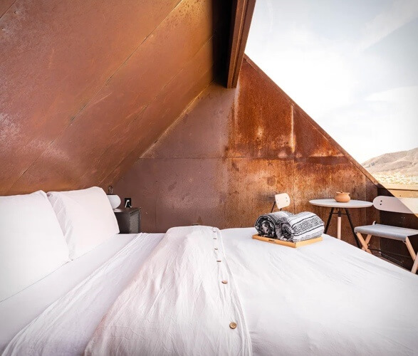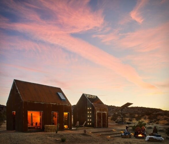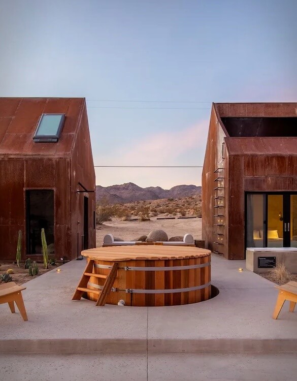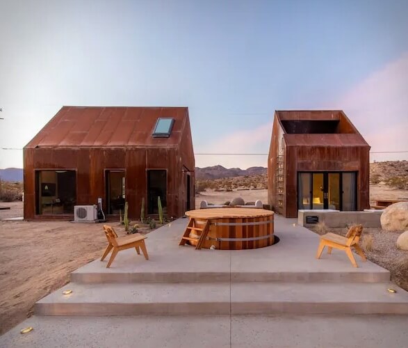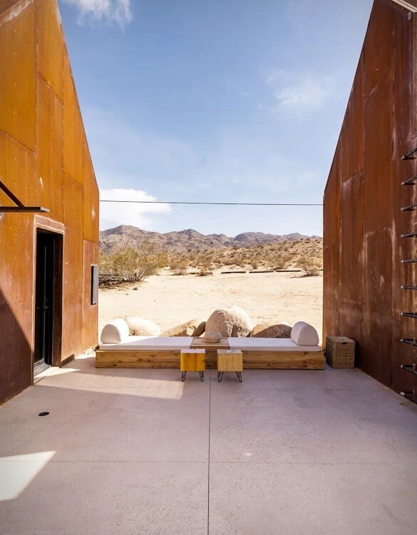Located just north of the famous Joshua Tree National Park, the design mainly consists of two tiny cabins clad in what may appear as wood. But they are actually clad in weathered steel to give them the impression of old, abandoned homes in a desert landscape. Its facade deceives its interior features though.