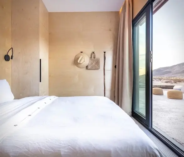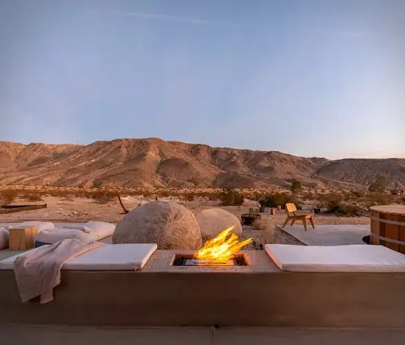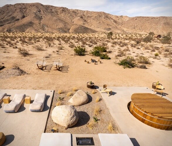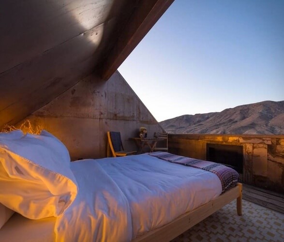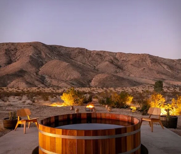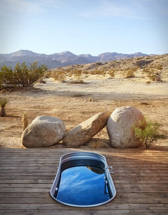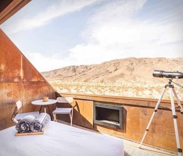 Moreover, the Joshua Tree Folly Cabin has a wooden deck equipped with a soaking tub, BBQ, and fire pit. Likewise, it keeps you connected through WiFi and keeps you comfortable amid the arid surrounding. It has air conditioning units, a refrigerator, TV, keyless door access, LED lighting, and a control system that runs the house. The best feature of the cabin is how it easily and comfortably connects guests to the rugged outdoor landscape.