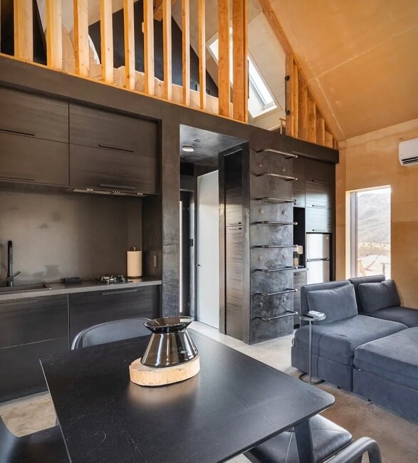 The Joshua Tree Folly Cabin offers a modern off-grid living experience. The larger cabin can ideally accommodate four but it can sleep six people comfortably. It has a dining area, lounge, and kitchen complete with a sink. It even has a mezzanine level equipped with a queen bed under a skylight and the downstairs area has a pullout sofa.