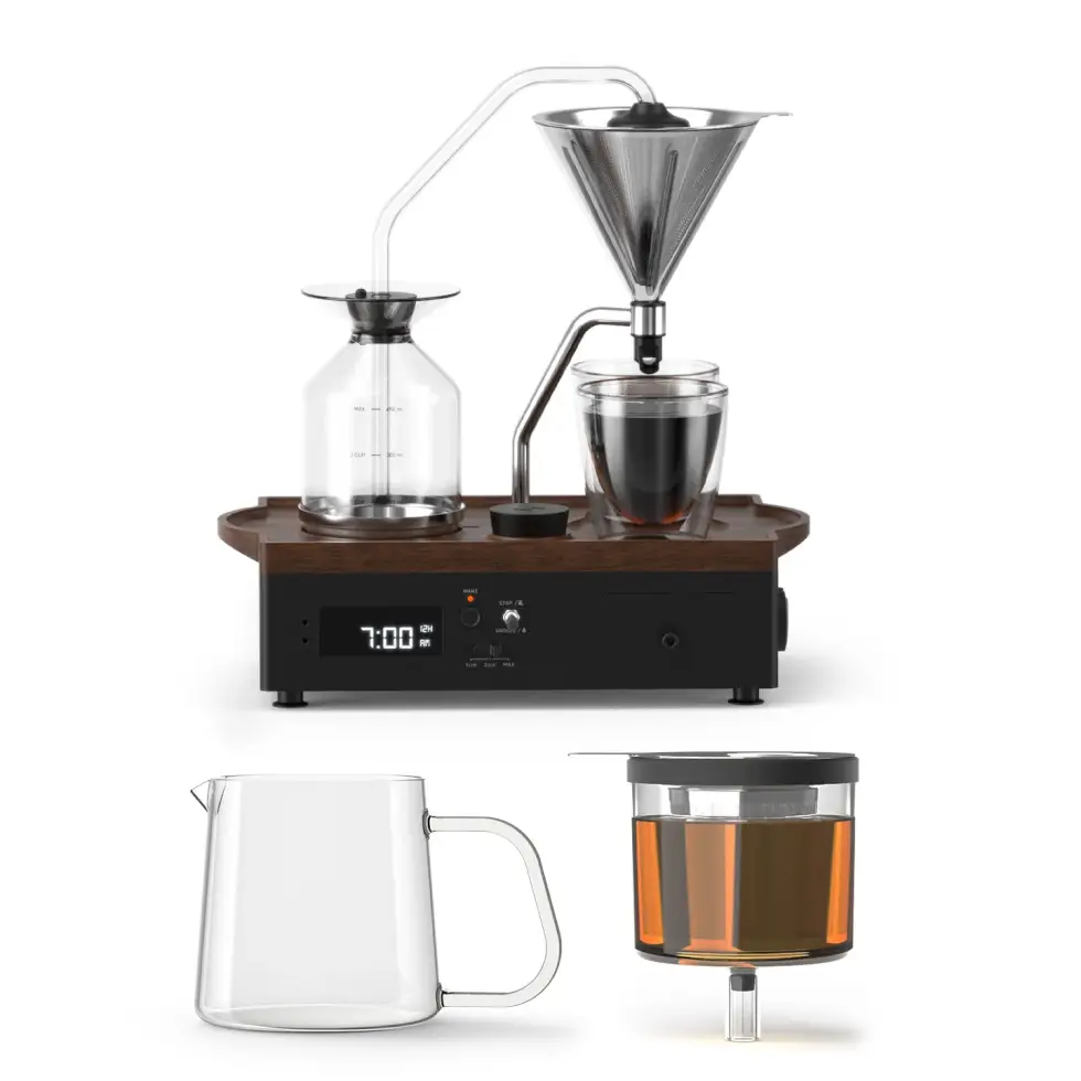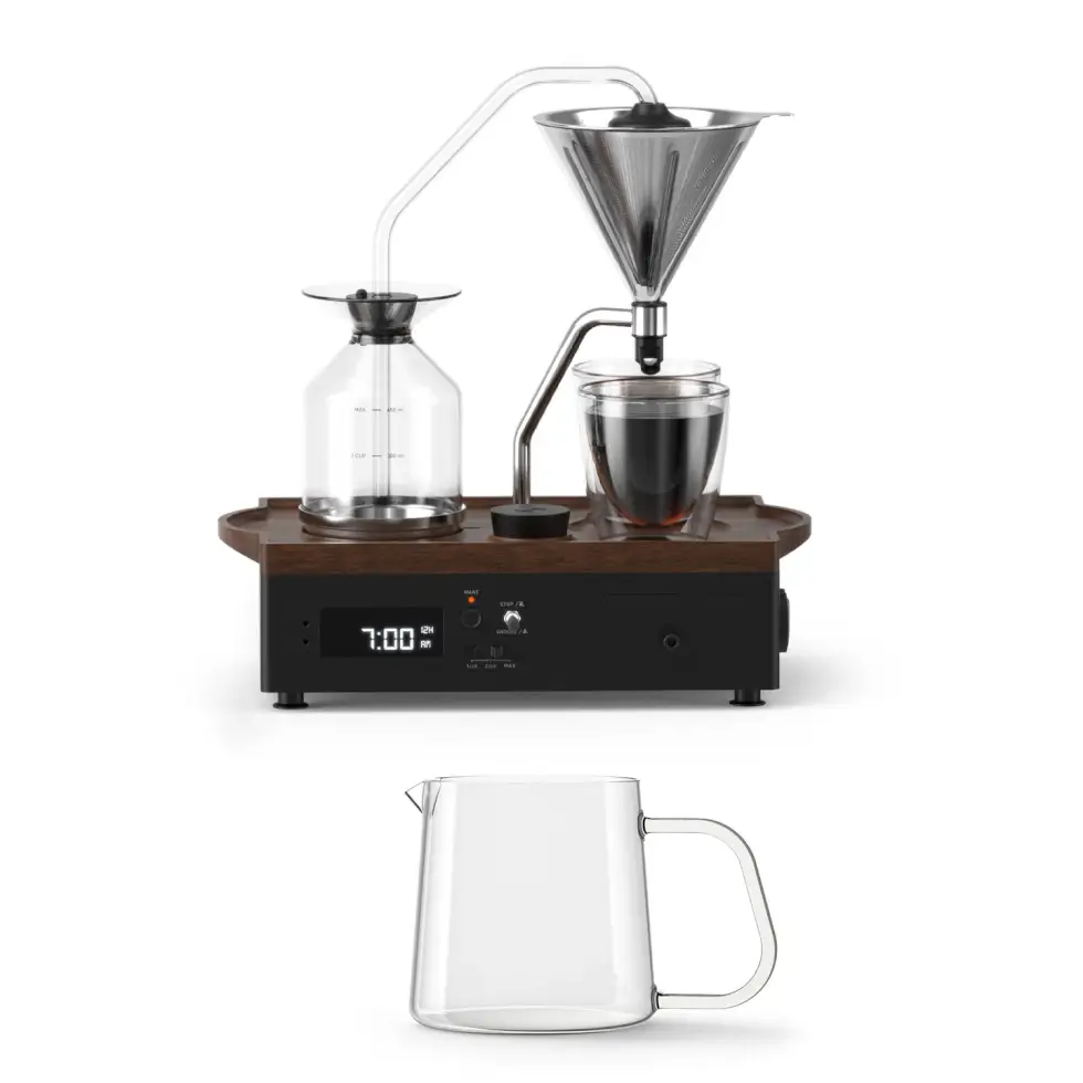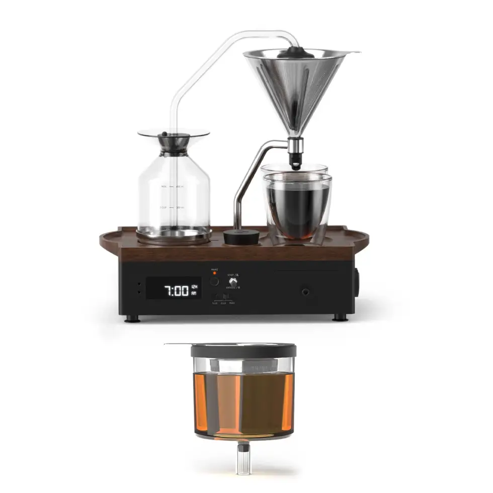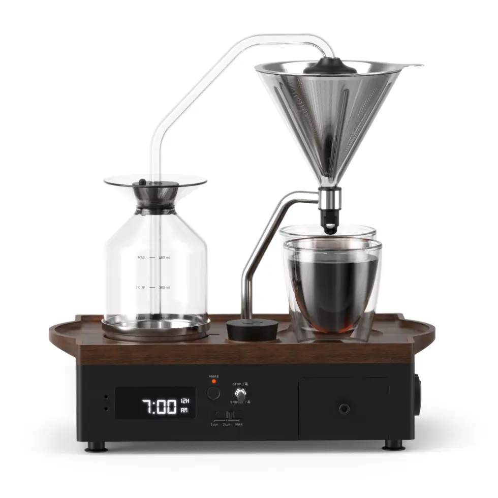 Joy Resolve’s Barisieur Coffee and Tea Brewing Alarm Clock comes with a storage container that holds over a week’s worth of coffee grounds. A smart induction coil boils water in three minutes and has an automatic shut-off. It brews coffee or tea to 201°F, has a refrigerate and milk vessel, and uses a reusable filter dripper for easy cleanup.