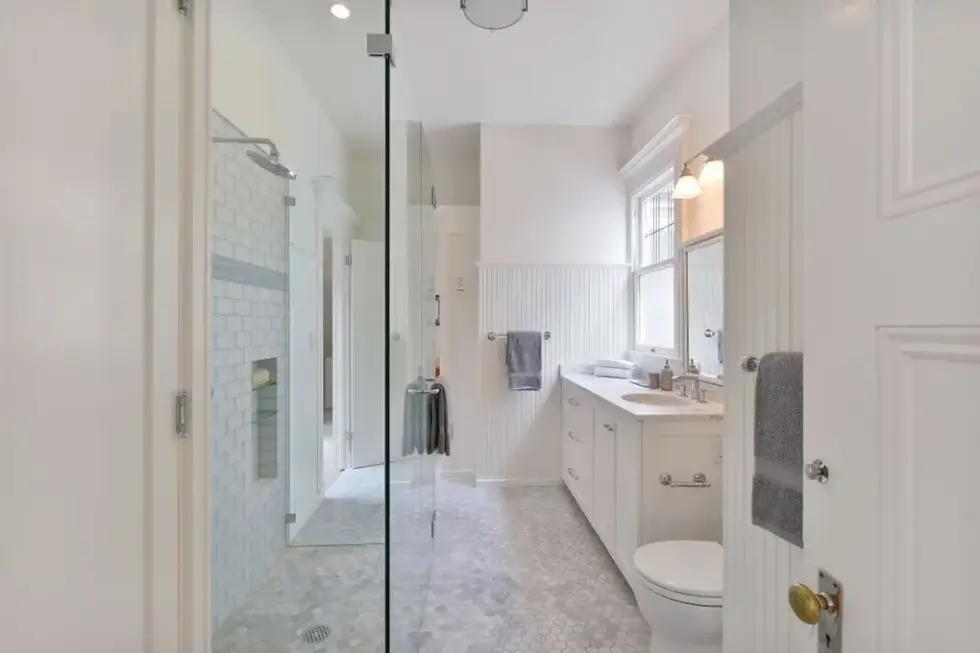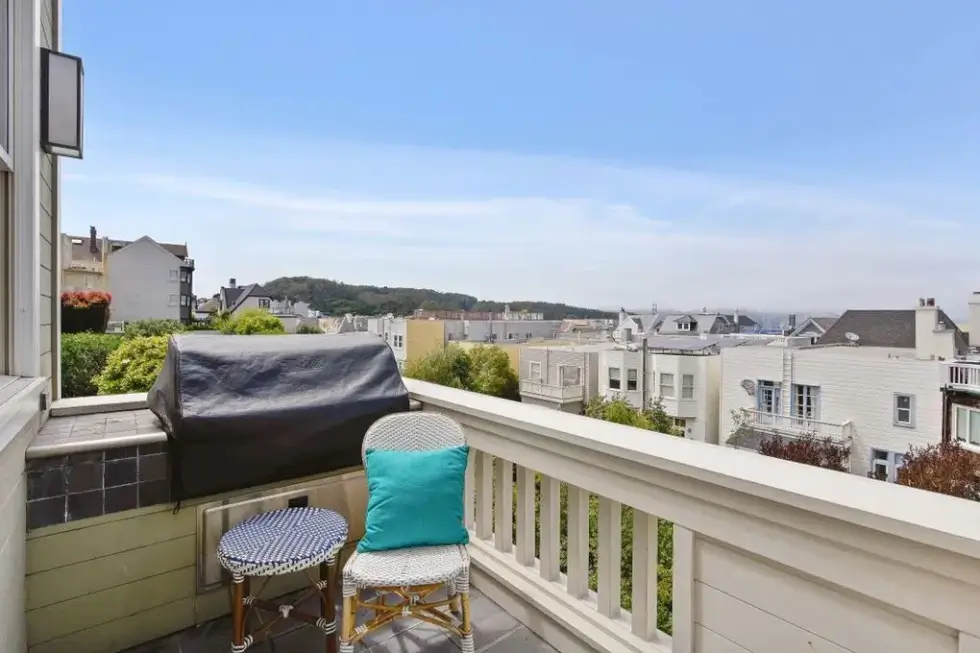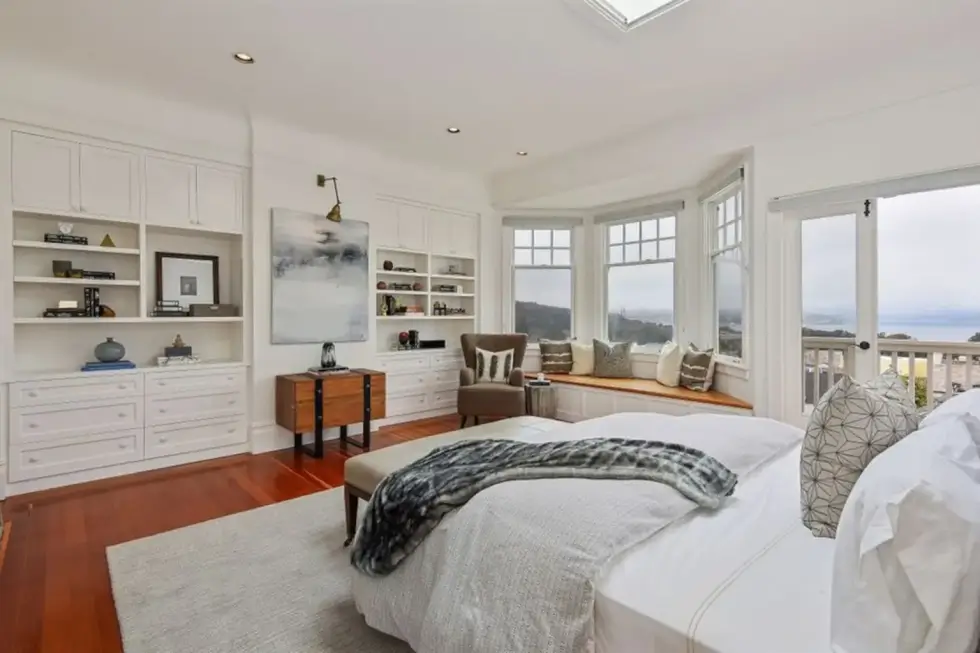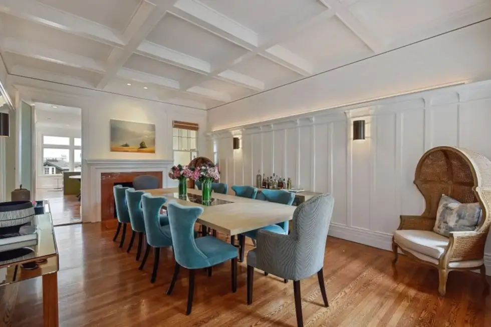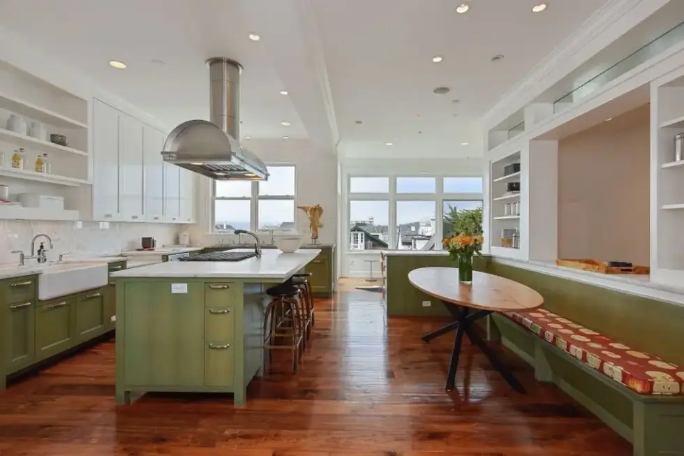 Moreover, lower level cabinets in the kitchen look cozy with their matte ocean blue paint complementing the pale olive green of the open shelving and top cabinets. The kitchen is also equipped with premium Sub-Zero appliances, a wet bar, while the breakfast nook and the balconies offer stunning views of the Golden Gate Bridge.