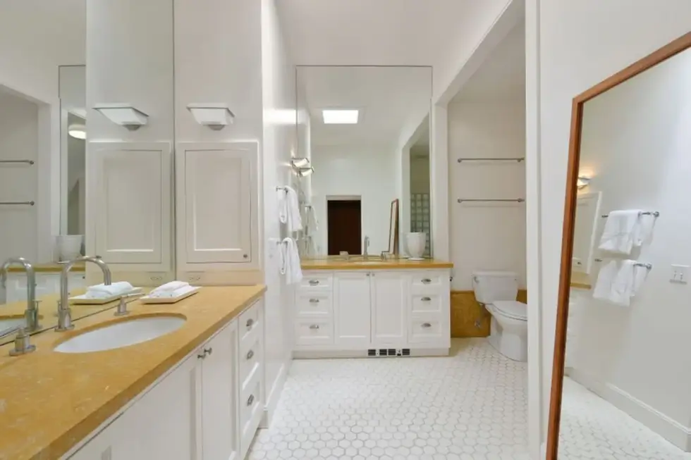 Behind the gates is a brick walkway that leads to the home’s column-ringed entry in which guests are welcomed by a stately foyer with a grand staircase. The award-winning actress and her cinematographer Daniel Moder made extensive upgrades to the Edwardian home, which hosts five bedrooms, four bathrooms, and two half-bathrooms in an expansive 6,300 square feet of living space.