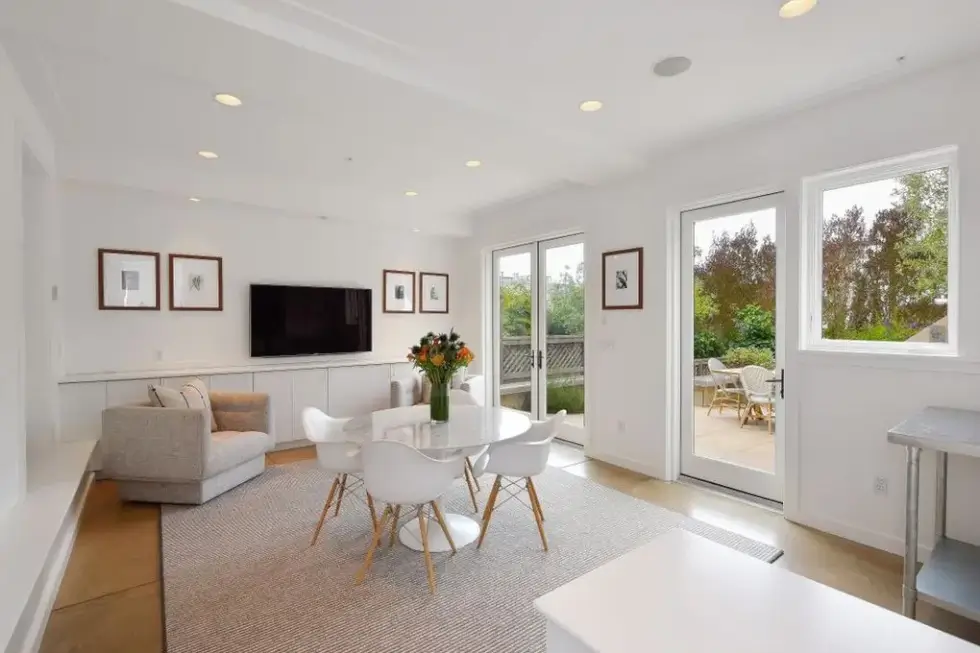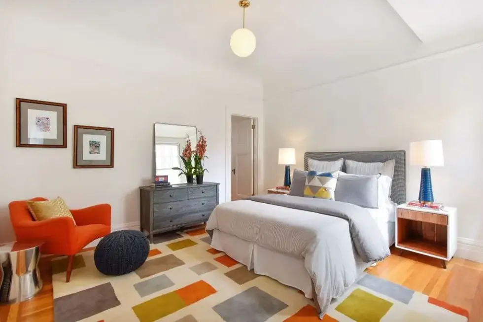 But they retained some of the period features in the Victorian home including the crown molding, the fireplace in the living room, and the stained glass windows and upgraded the place with modern furniture and new paint colors. Likewise, the dining room features intricate coffered ceilings and one of the bedrooms has a nifty sunroom.