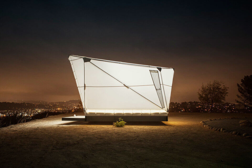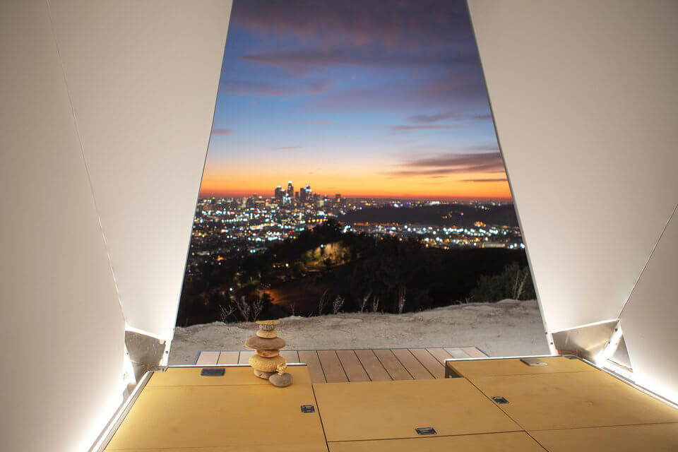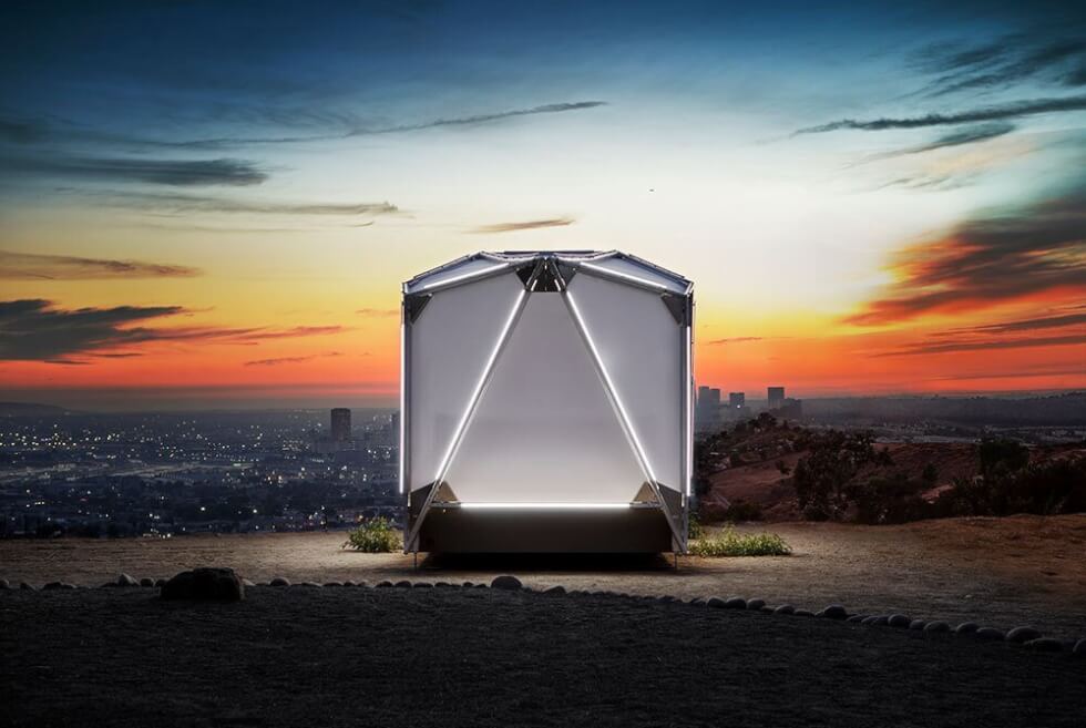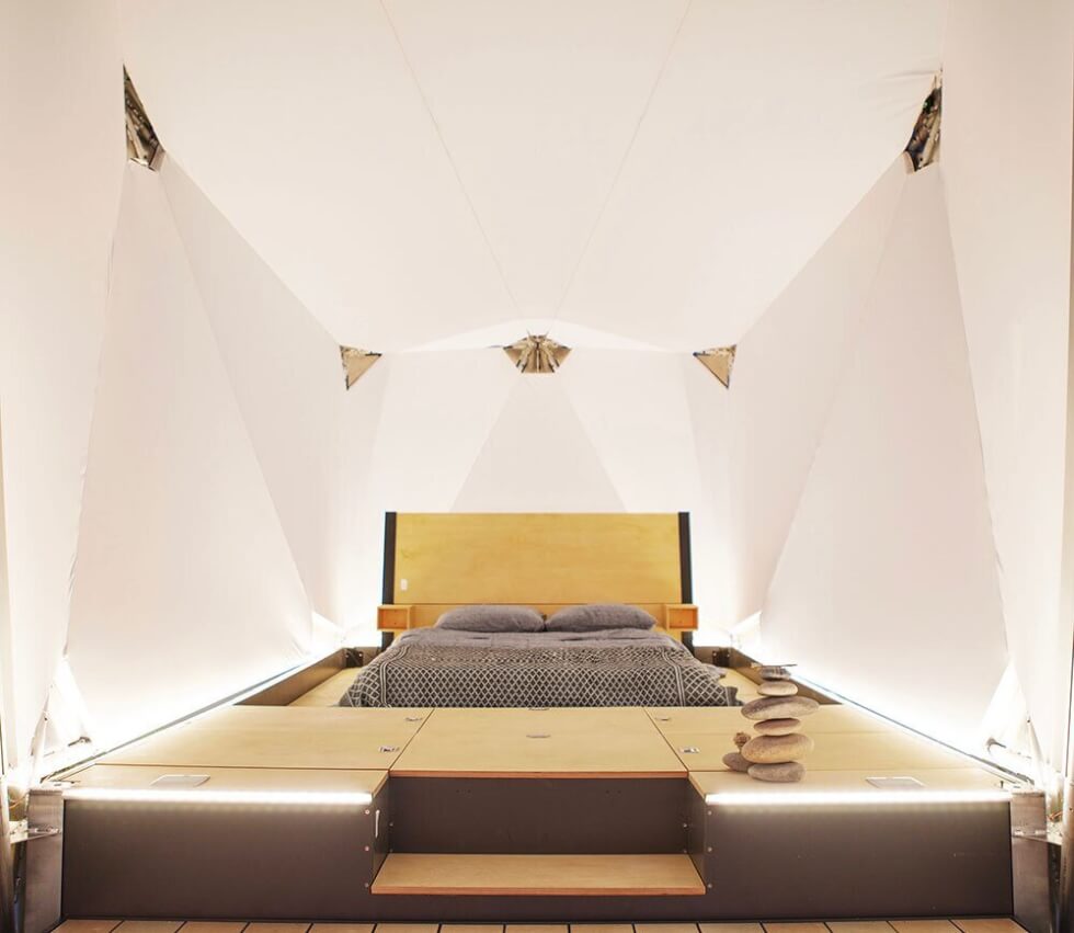 This is no ordinary tent from the inside to the outside. Its trapezoidal form with its glowing frame pays homage to the “2001: A Space Odyssey.” It has windows for added ventilation or light while an entryway provides panoramic views of its surrounding scenery. Inside the 111-square-foot space holds a Nectar queen-size bed, tiled Baltic birch wood flooring that hides ample storage space. It boasts lofty ceilings for comfort and so tall people do not have to crouch down. The expansive interior can house a desk and a chair.