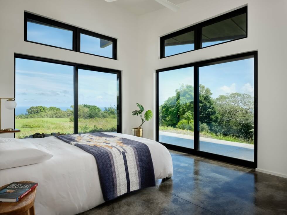 The Kailua Hale home’s official description reads: “The low corner of the roof provides protection from the area’s weather and the corresponding roof on the opposite side of the house is protected from the western sun.” Elsewhere, full-height glazing and clerestory windows maximize natural lighting during the day.