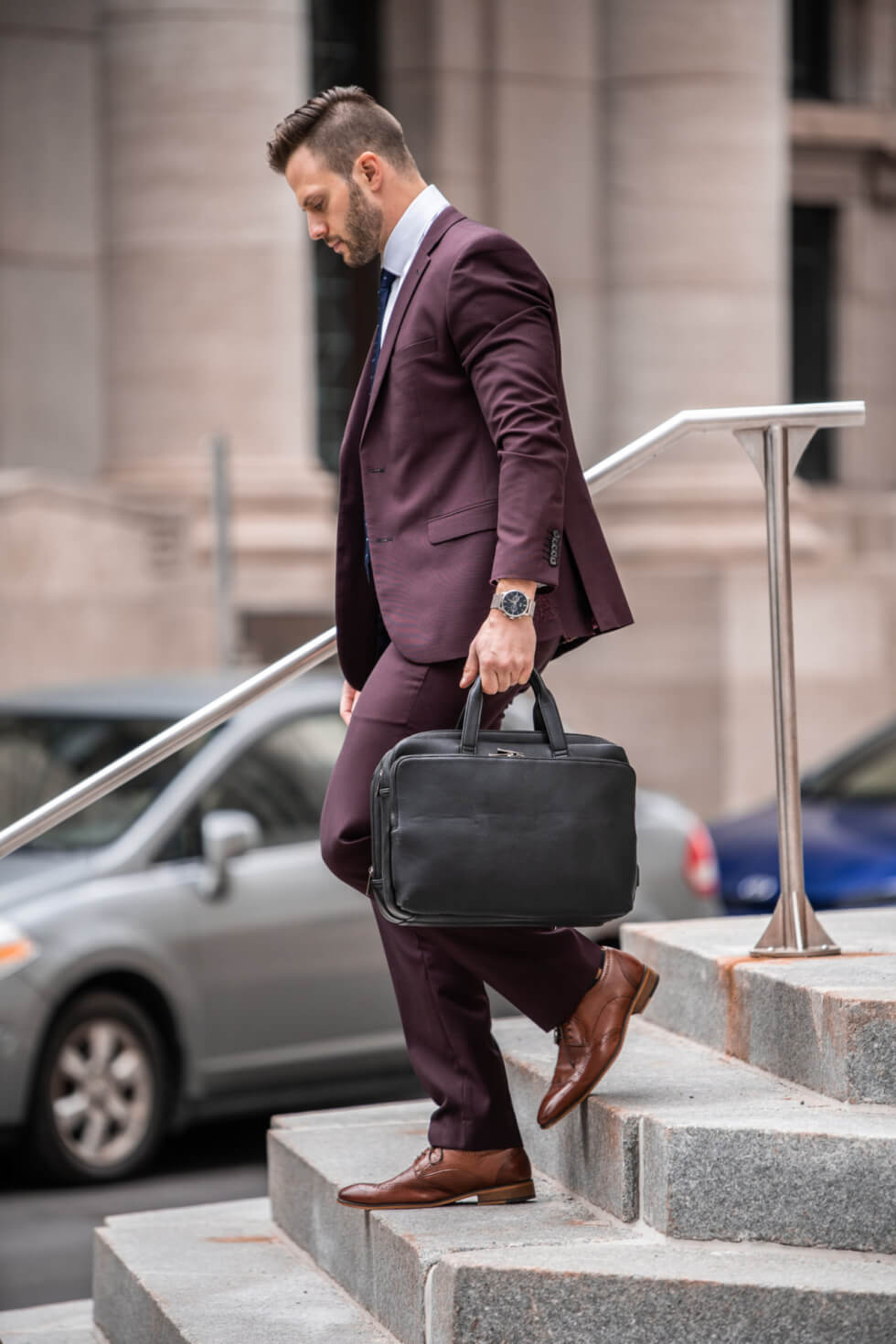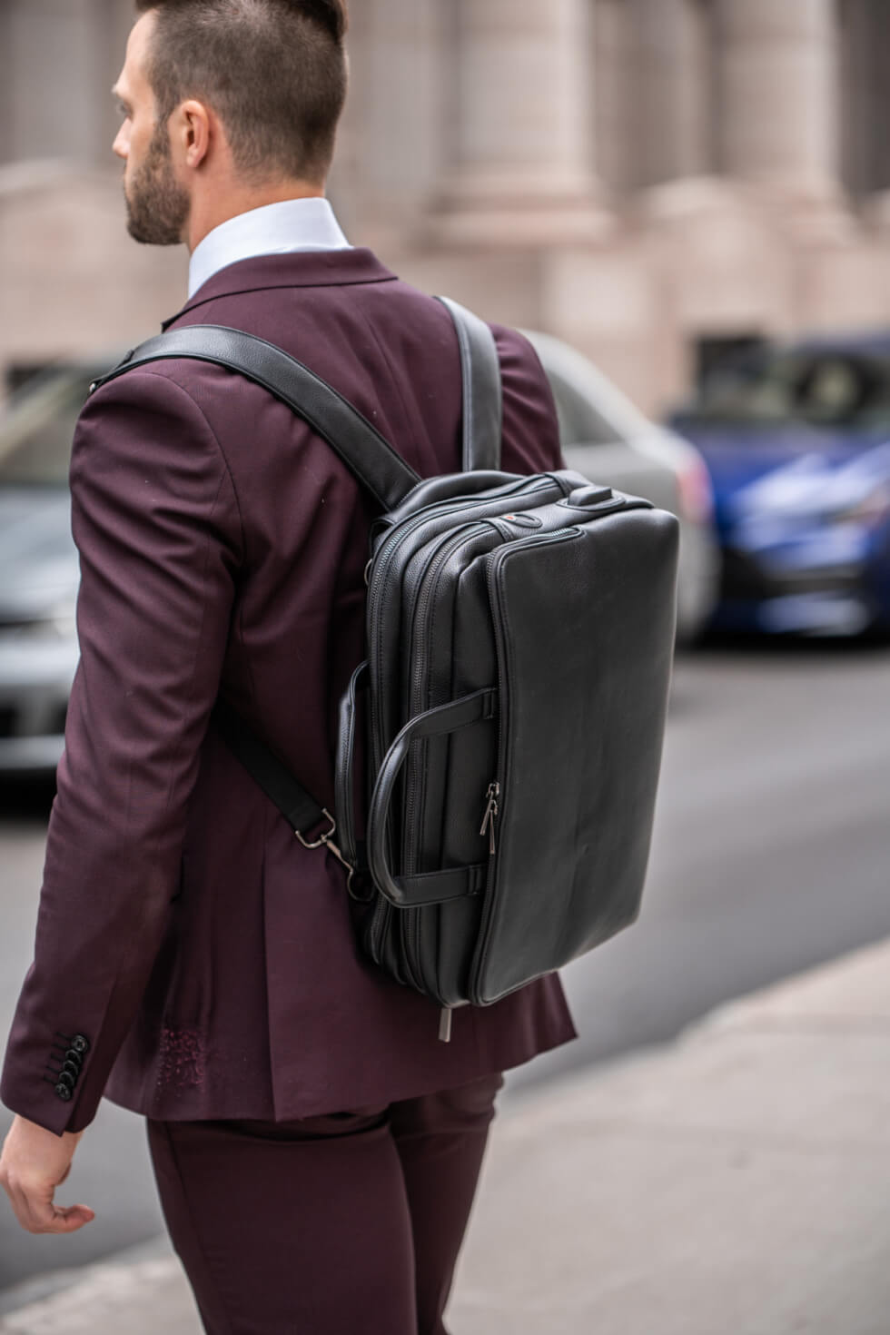As for portability and convenience, the briefcase from Kanevas easily switches from handheld to backpack carry in two simple clicks. The stowaway backpack straps are neatly concealed in the zippered back pocket.  It retains its elegant edge all throughout regardless of carrying method.