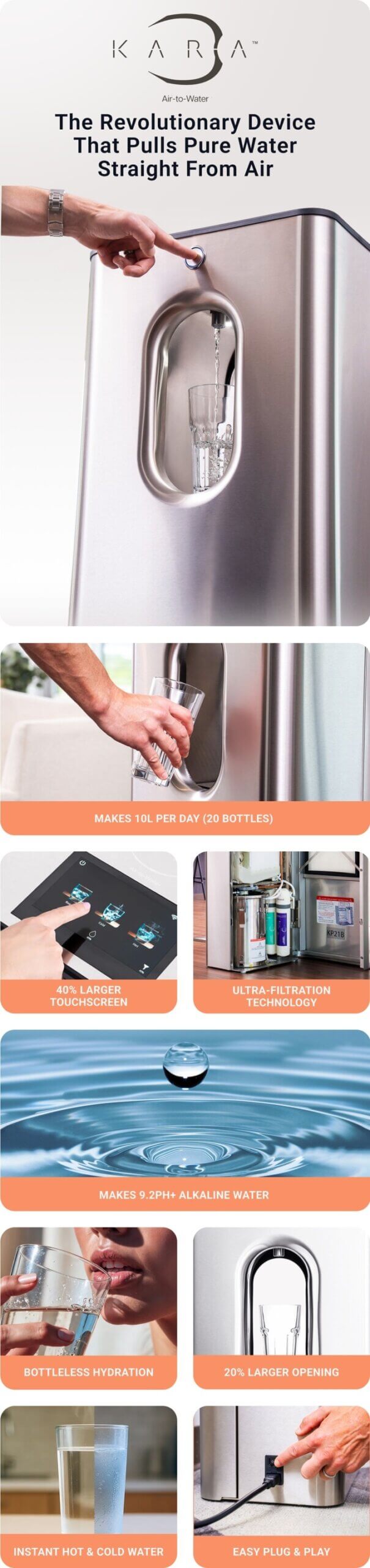 The revolutionary Kara Pure 2 turns air into safe and clean drinking water with its patented Air-to-Water advanced desiccant technology. It extracts water straight from the air and makes it healthier with added minerals.