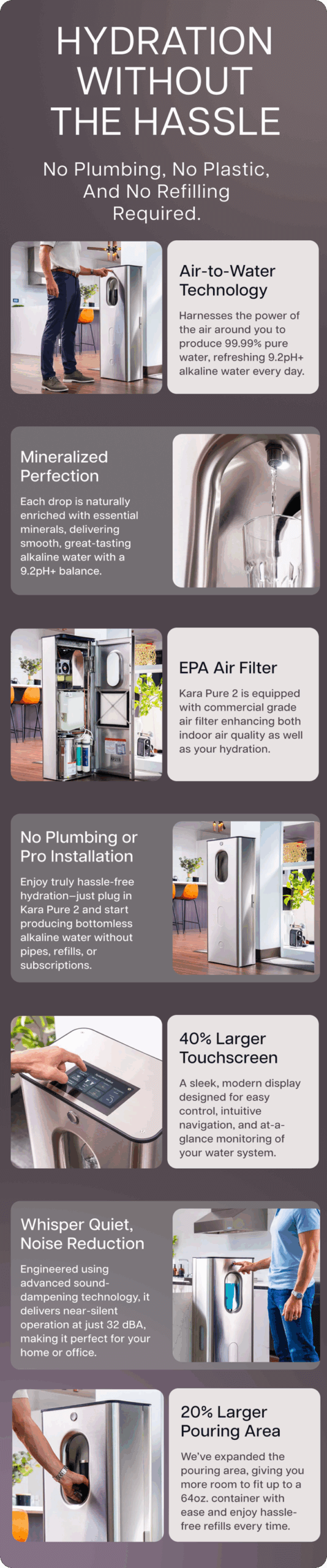 Meanwhile, its engineered sound-dampening technology ensures it operates quietly in the background at a 32dBA. Other next-gen features in the Kara Pure 2 includes a commercial grade recirculating water feature that eliminates quarterly descaling for easier maintenance.