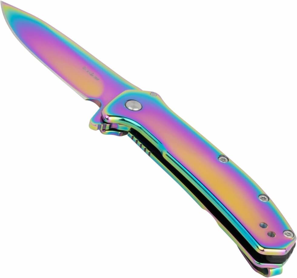 Kershaw outfitted the Outcome Rainbow in an all-rainbow silhouette from the handle to the blade. The 2.8-inch drop point blade, crafted from 8Cr13Mov stainless steel, is in a rainbow spectrum PVD finish. It gives off a dazzling array of colors while offering great corrosion resistance and edge retention.