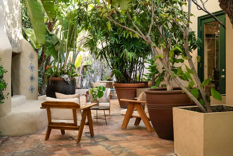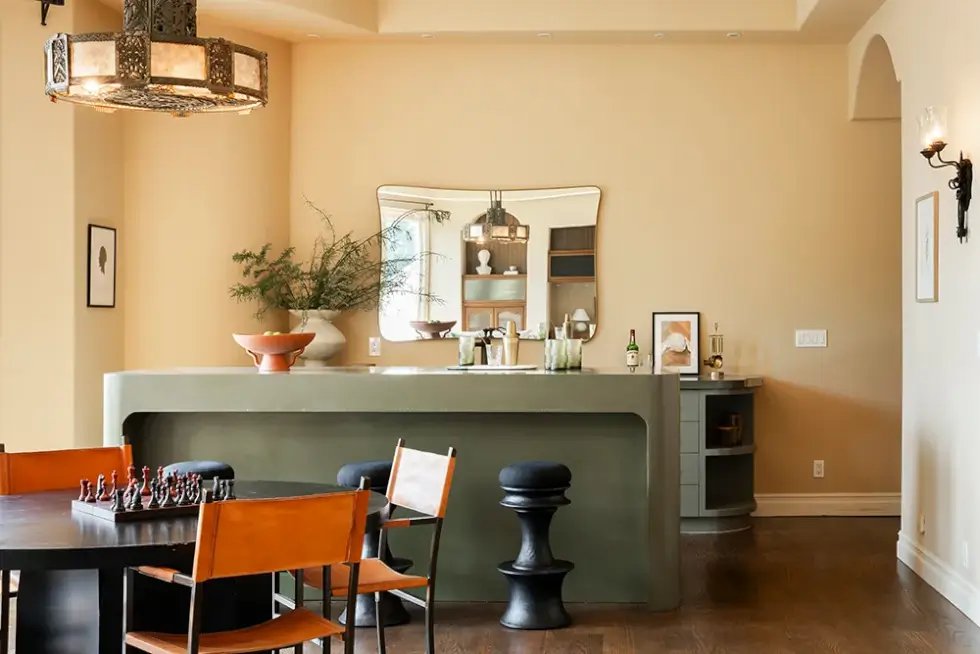 The property is notable for its verticality and curved façade which one can marvel from the street. Inside, it effortlessly blends indoor/outdoor living with a dramatic entryway that showcases an ornate stairway and nearly 12-foot ceilings. The home also boasts floor-to-ceiling windows, a combination of hardwood and terra cotta tile flooring, detailed lighting choices, curved doorways, and meticulously custom-crafted ironwork.