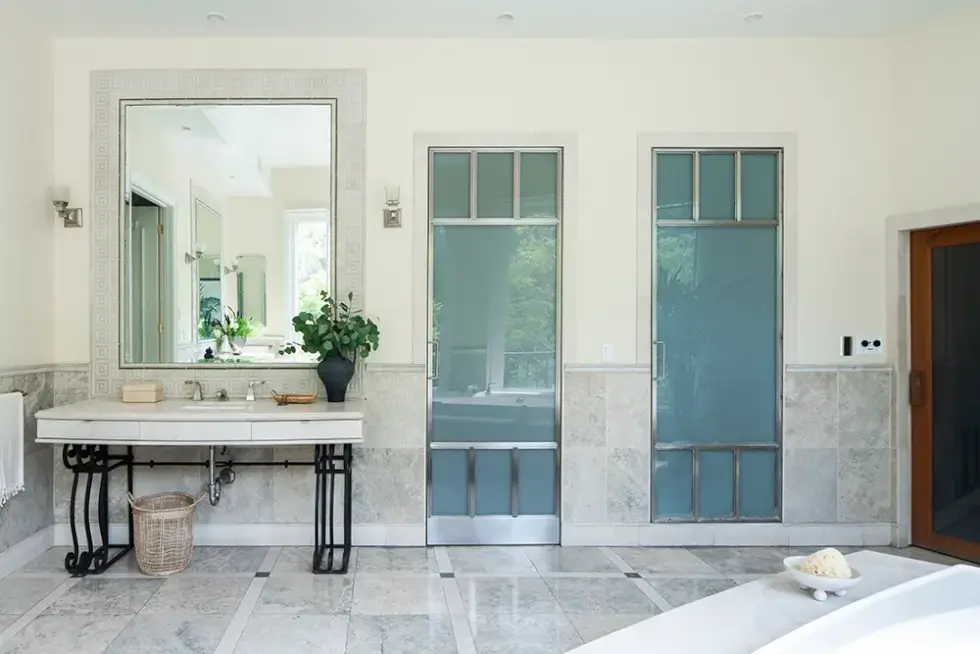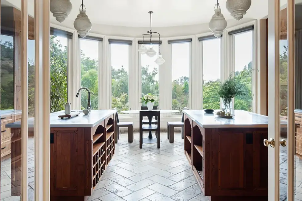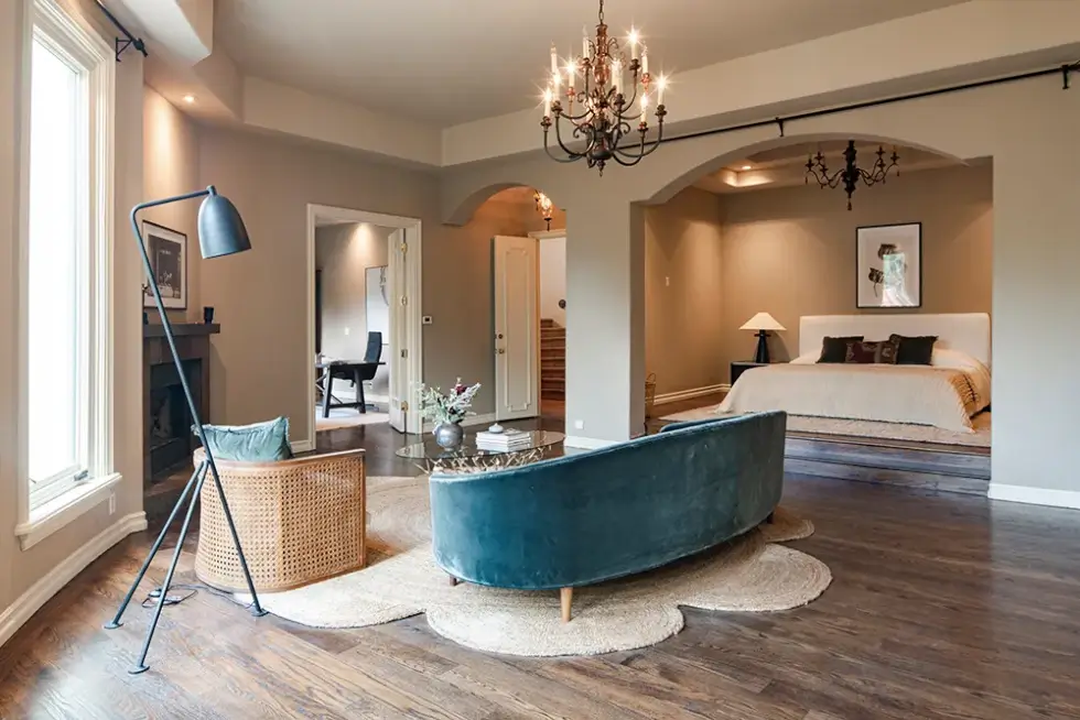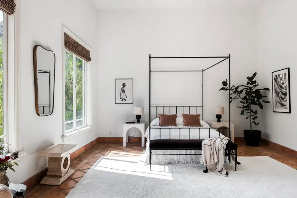 Adjacent to the living room is a spacious dining room with doors leading to the outdoor deck. Then there’s a chef’s kitchen equipped with wood cabinetry, limewash paint, and hanging, sculptural pendant lights. Meanwhile, the second floor hosts the primary suite reminiscent of a Parisian apartment, which has an office, raised bedroom space, floor-to-ceiling windows, living area with fireplace, two walk-in closets, and a grand bathroom equipped with two vanities, a sauna, water closet, and soaking tub.