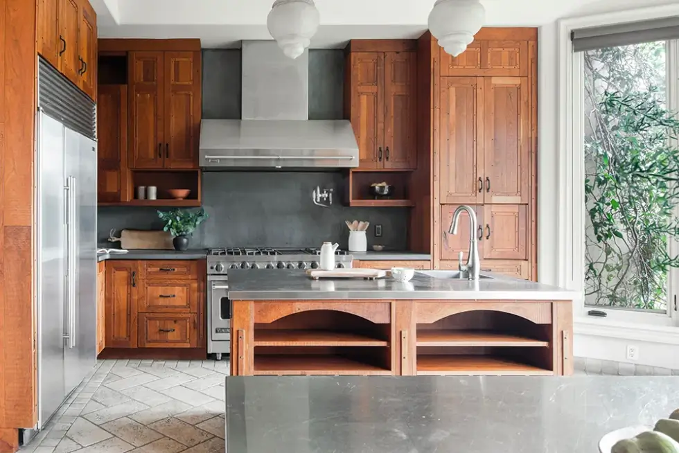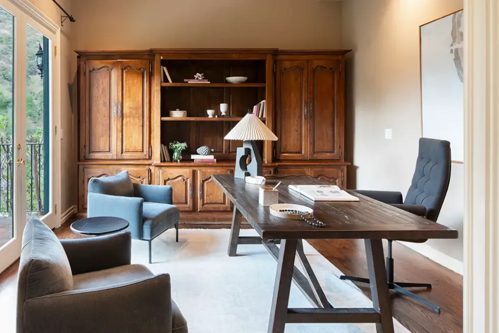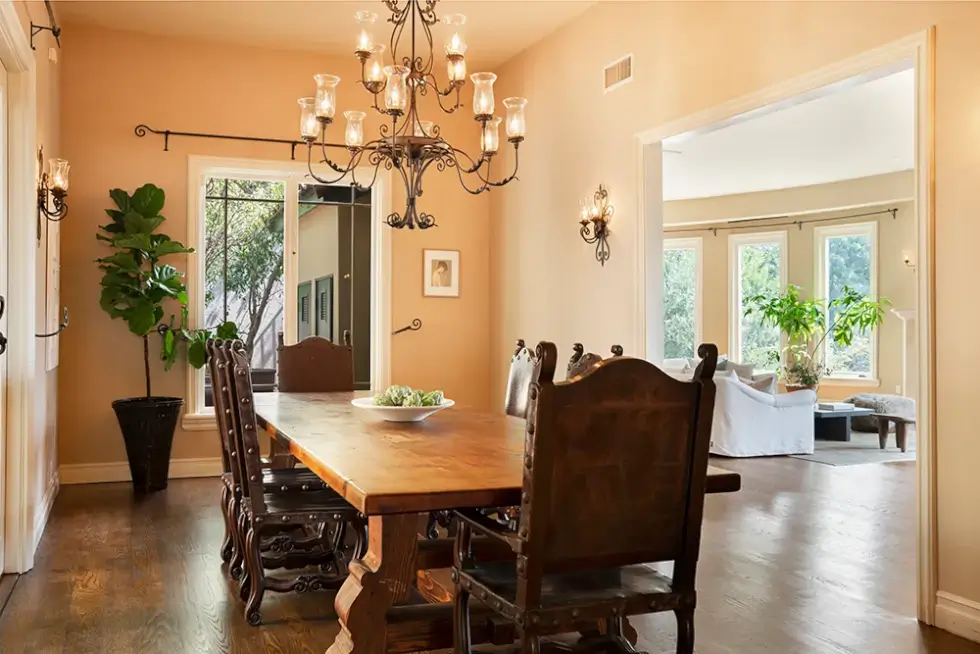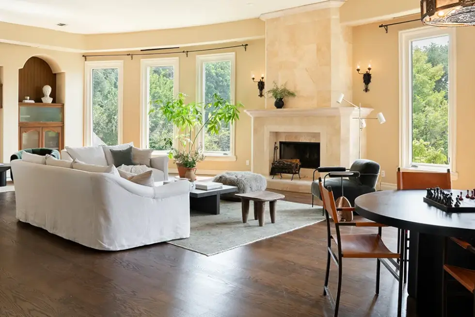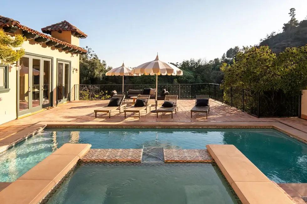 Smith’s 7203 La Presa manse has an elevator for easy access from the three-car garage to each of the three floors. The top floor boasts floor-to-ceiling windows that welcome abundant natural light and offer breathtaking mountain views. On this floor is an expansive living room which features a stately fireplace, built-in wood cabinetry, wet bar, art deco light fixture and nearly 12-foot-high ceilings. French doors open to the top-level outer deck adorned with multiple seating areas, an adobe fireplace, potted plants, and pool and spa overlooking Runyon Canyon.